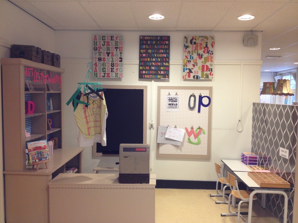 Ook bekeken we samen het digitale prentenboek “Het Letterwinkeltje”. En wat bleek…staat er sinds vandaag in onze kleutergang precies zo’n winkeltje! Dat wordt straks lekker veel letters kopen en verkopen tijdens het speelwerken!