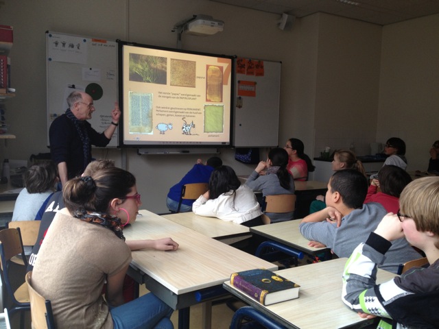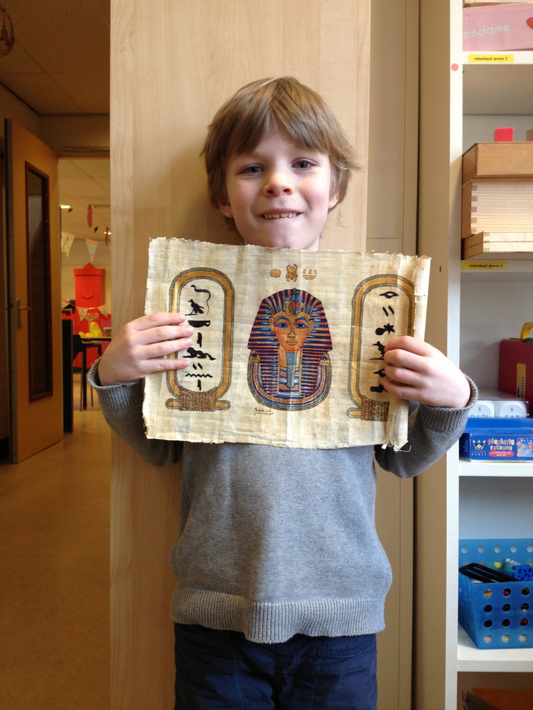 Deze week een introductieles over het project en heel veel geschiedenis over hoe taal ontstond, de eerste vormen van papier en de boekdrukkunst. En dan neem je meteen een prachtig papyrusvel mee naar school om aan je klas (3B) te laten zien! Wat goed, Victor!