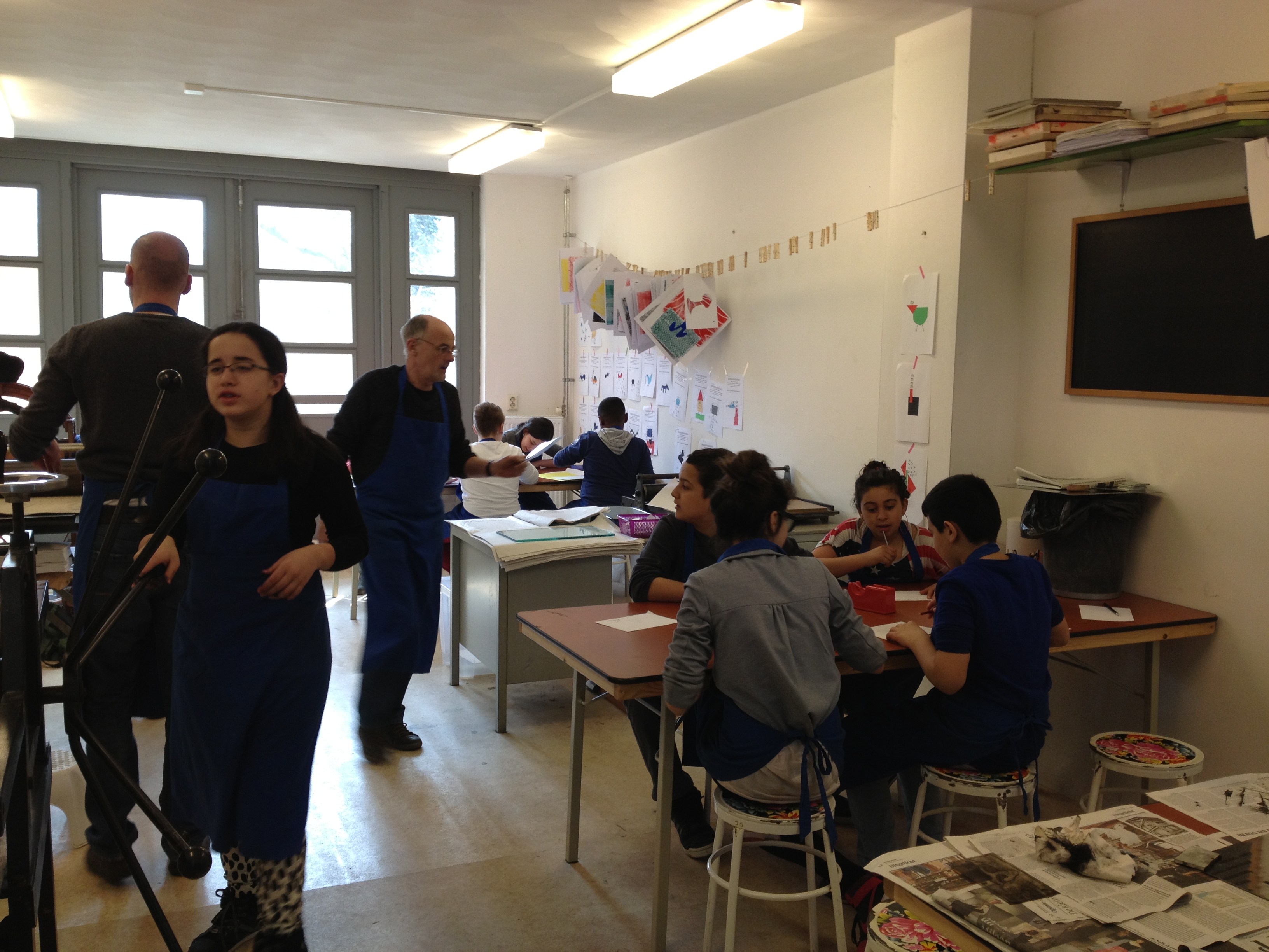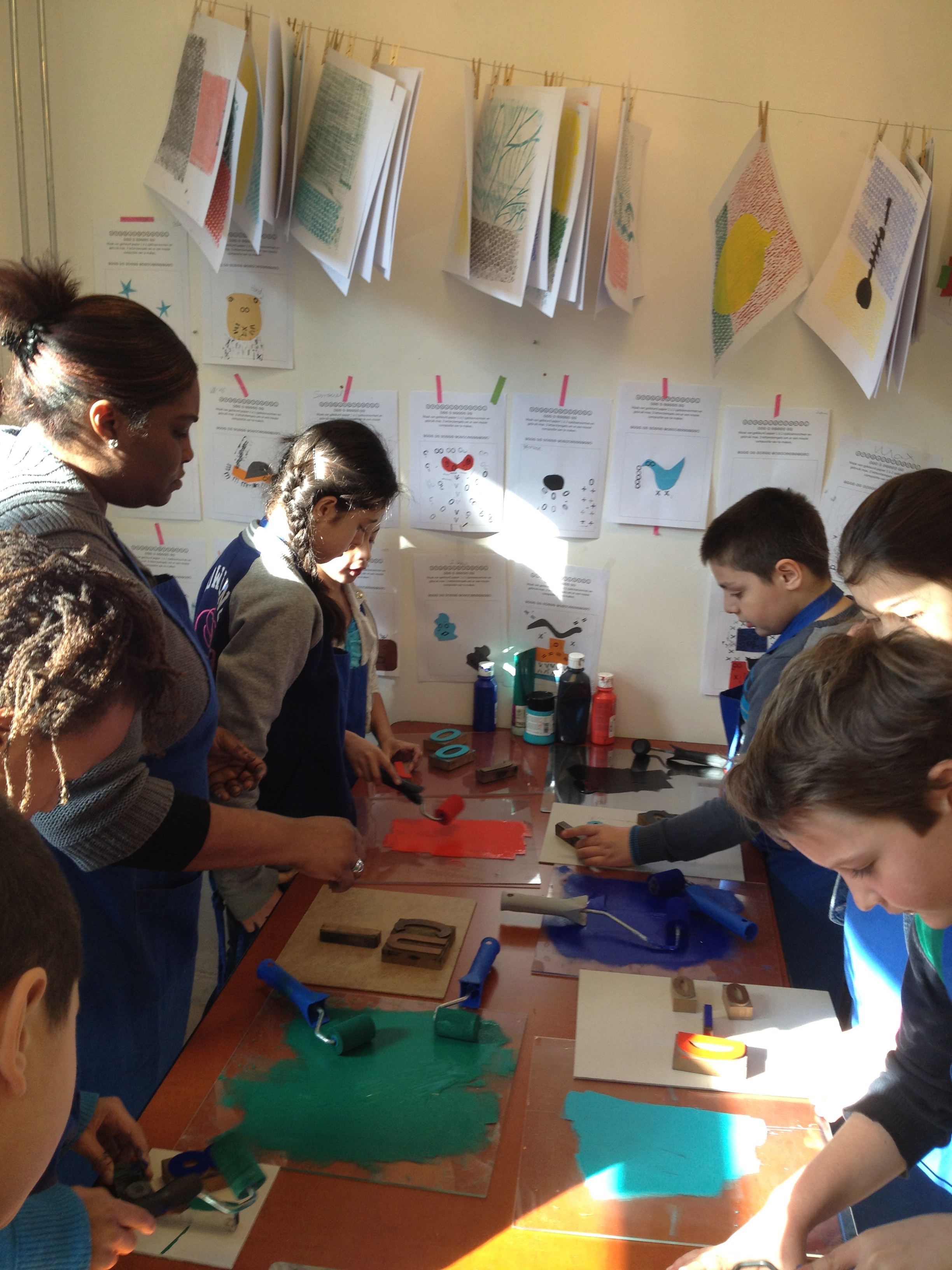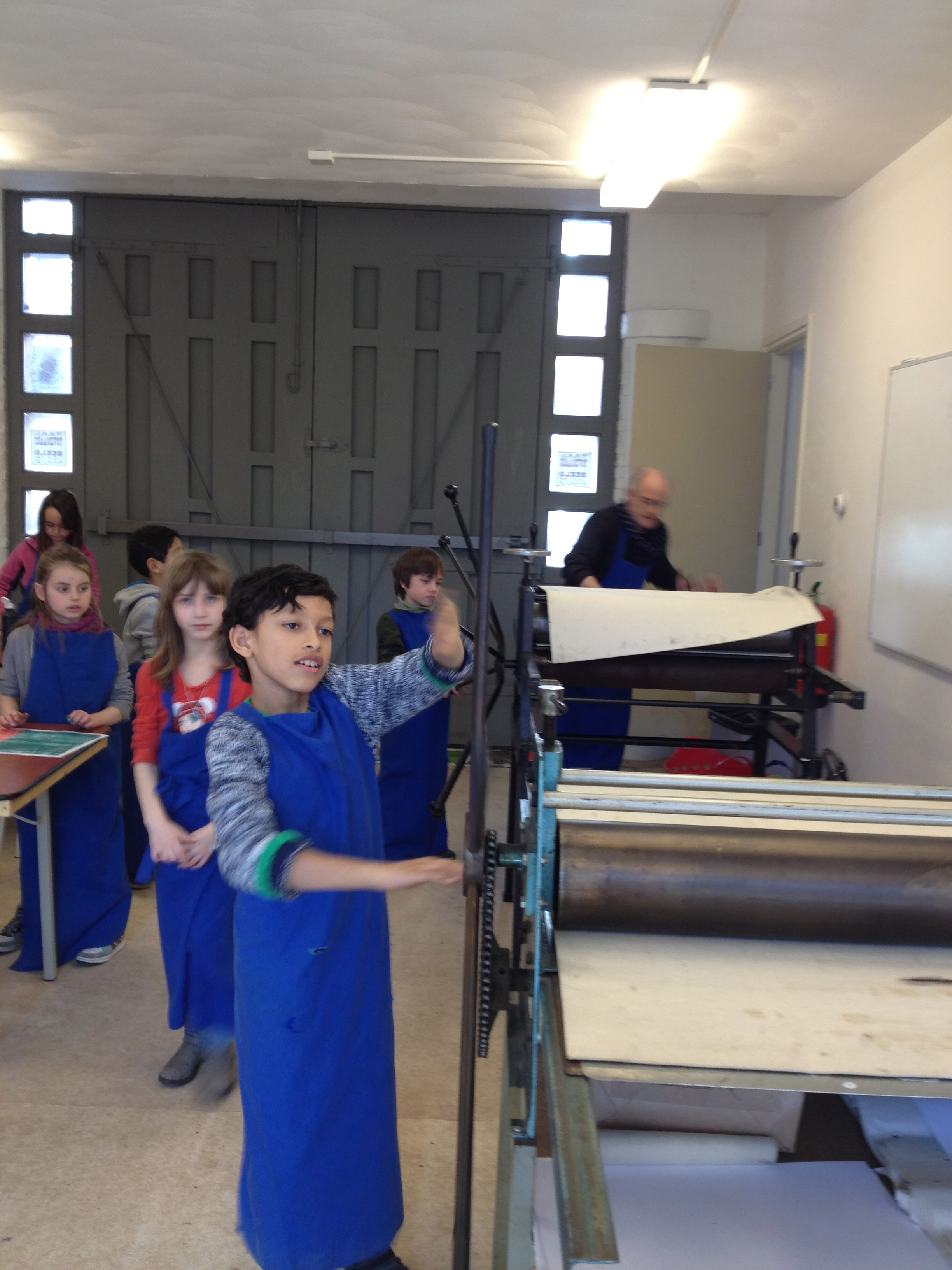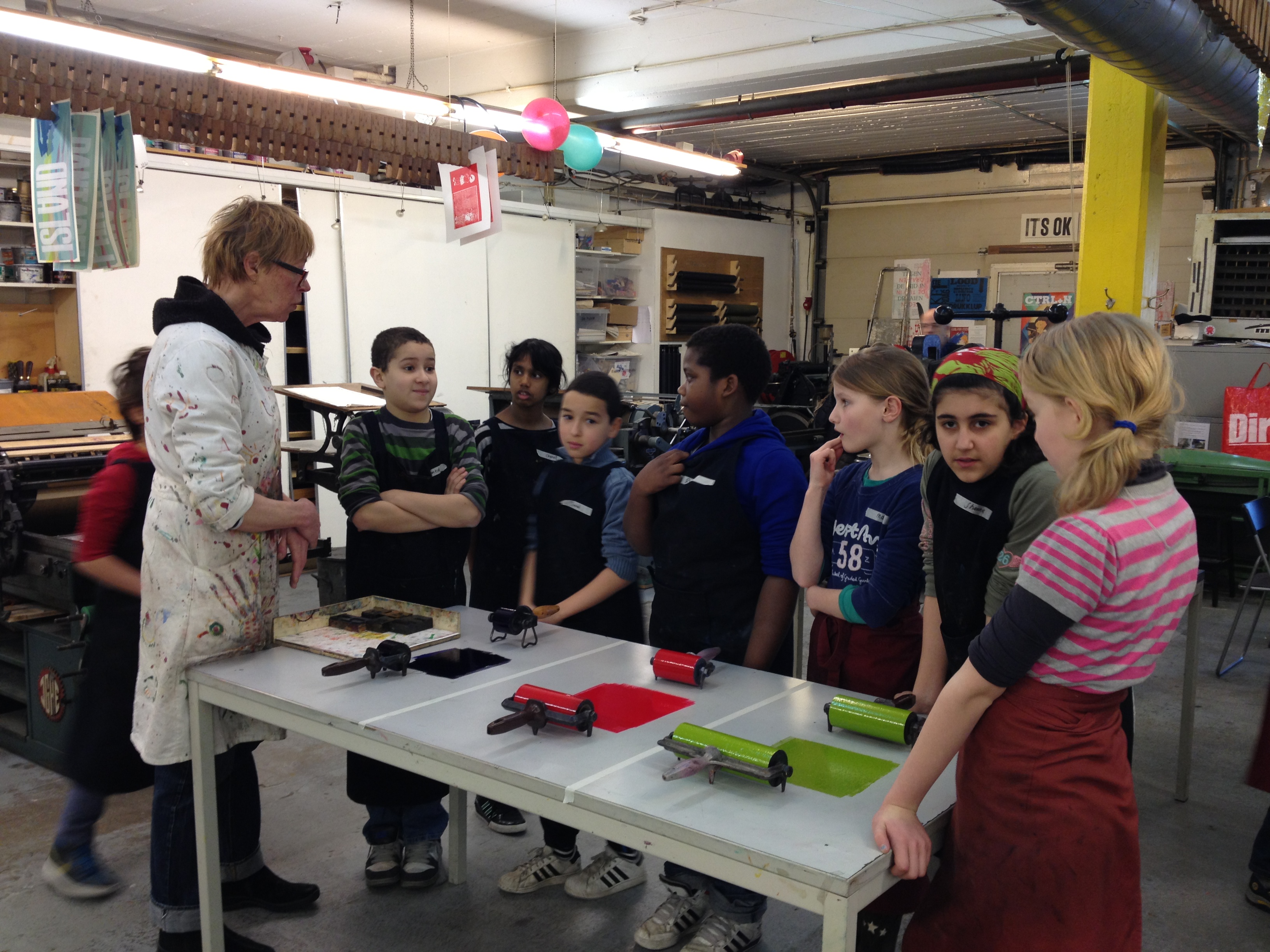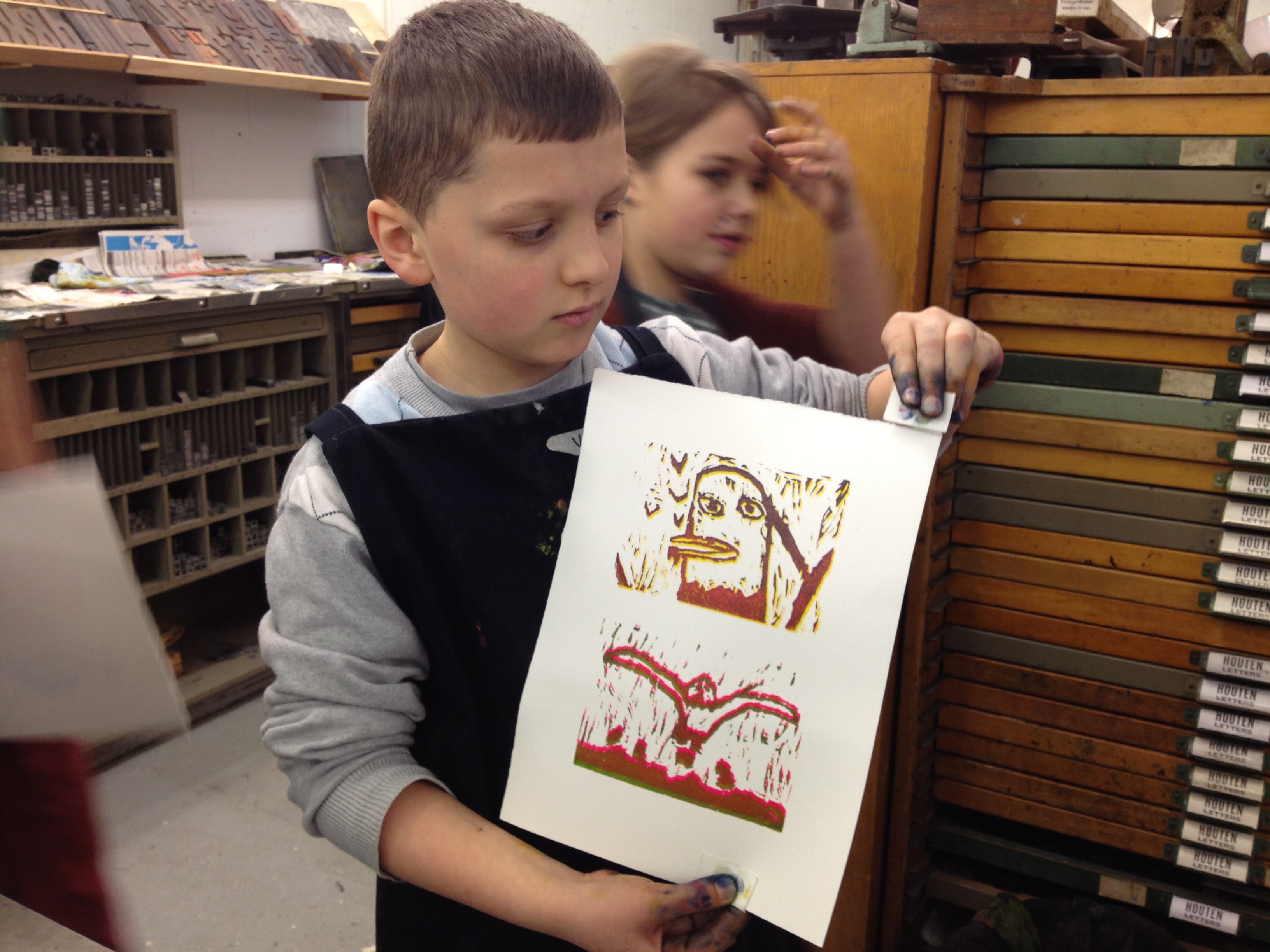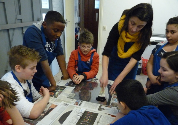 Na 7A vorige week, toog 7B vandaag naar het Grafisch Werkcentrum. Er werd in de voorgaande weken al zeer enthousiast in de klas aan hun persoonlijke linosnedes gewerkt. Vandaag werden ze dan eindelijk afgedrukt onder de persen van het GWA! De hele werkplaats was tot 12 uur hun speelplaats waar volop gerold werd met inkt, gerold werd de persen èn gerold werd met onze ogen! Want wat een verwondering bij iedereen na het bekijken van het resultaat na iedere drukgang. Naast de eigen linosnedes werden er ook prachtige letterbeelden gedrukt. Nu de haiku er nog bij en klaar is het eindwerk.