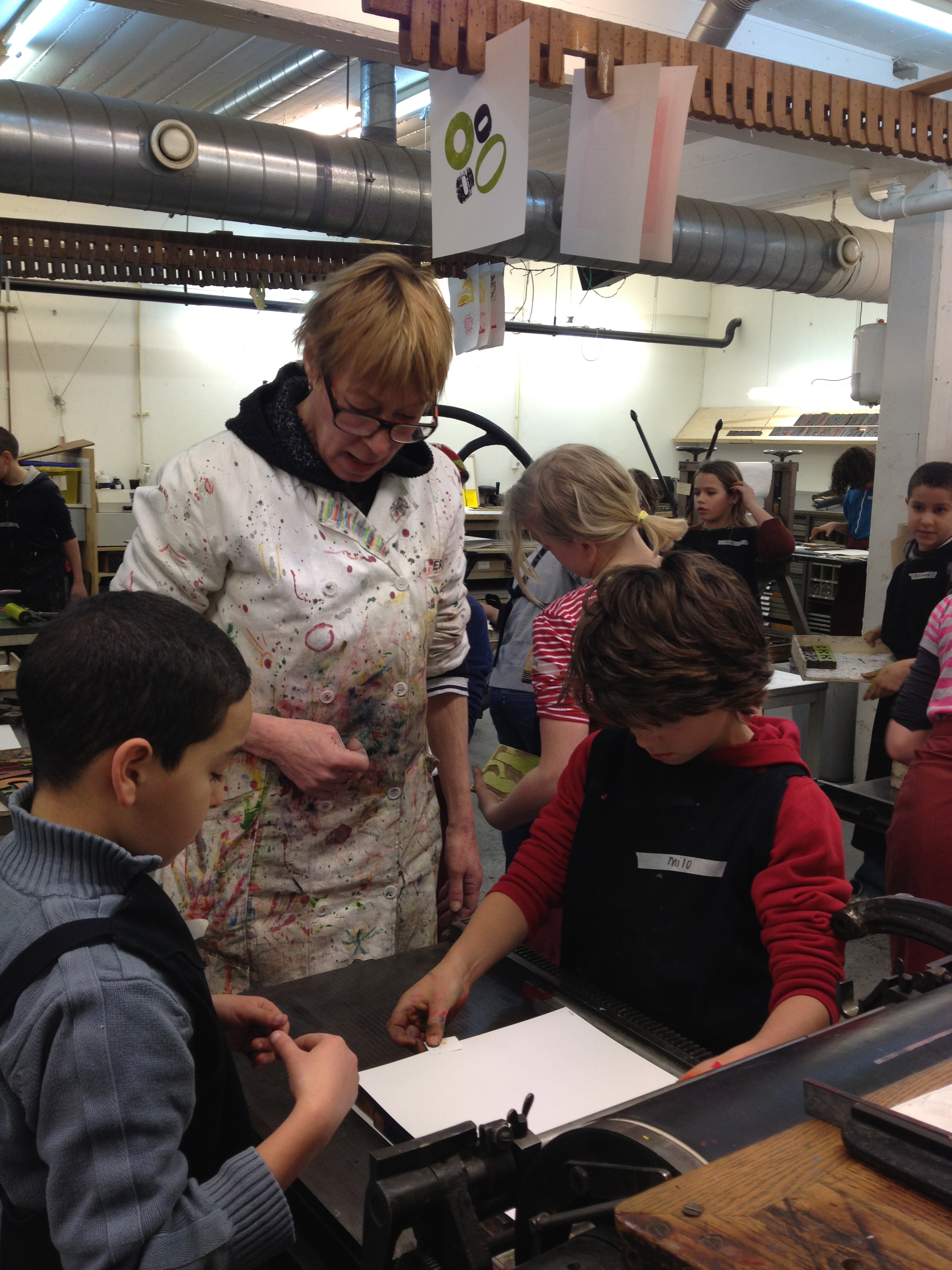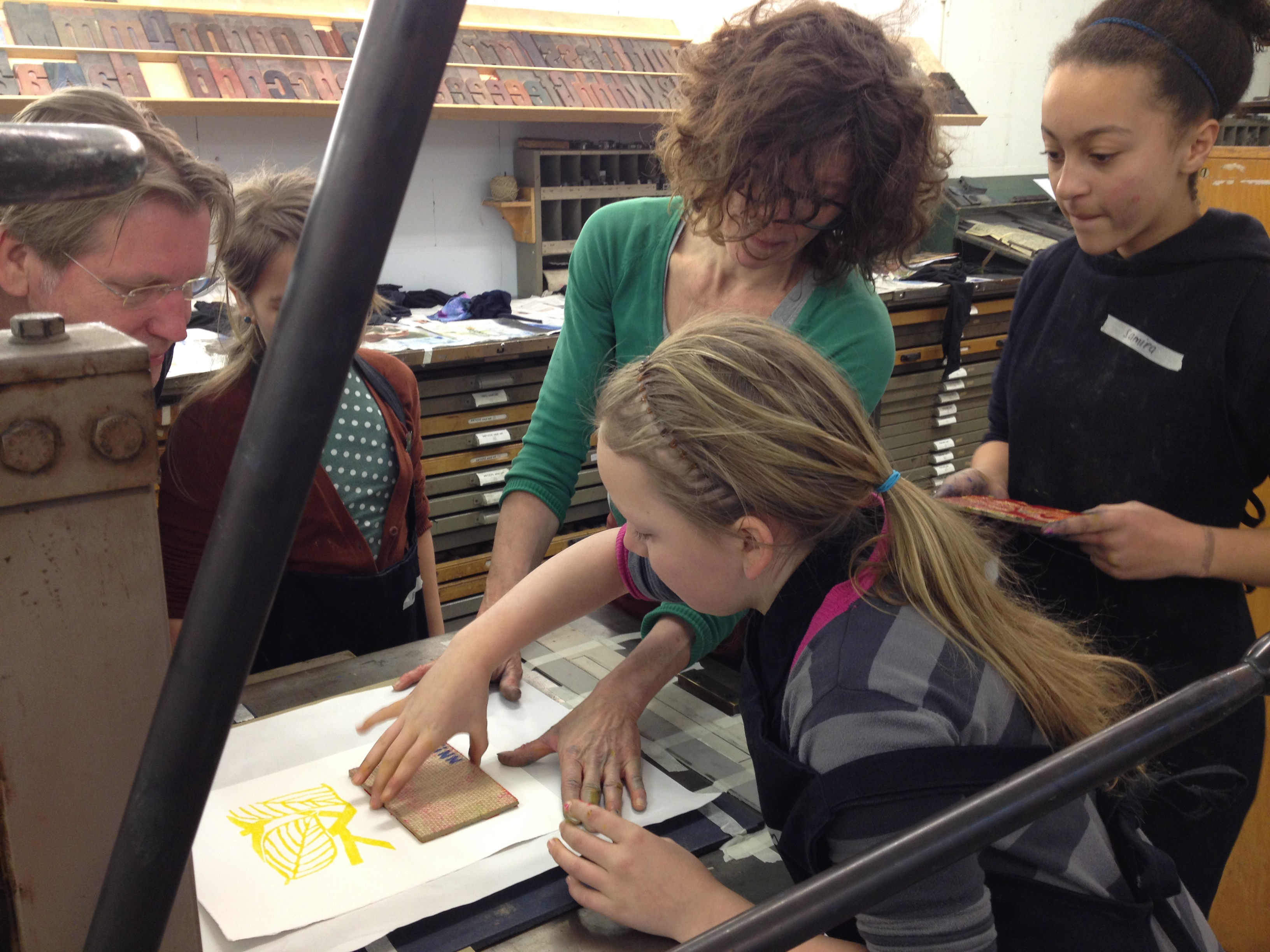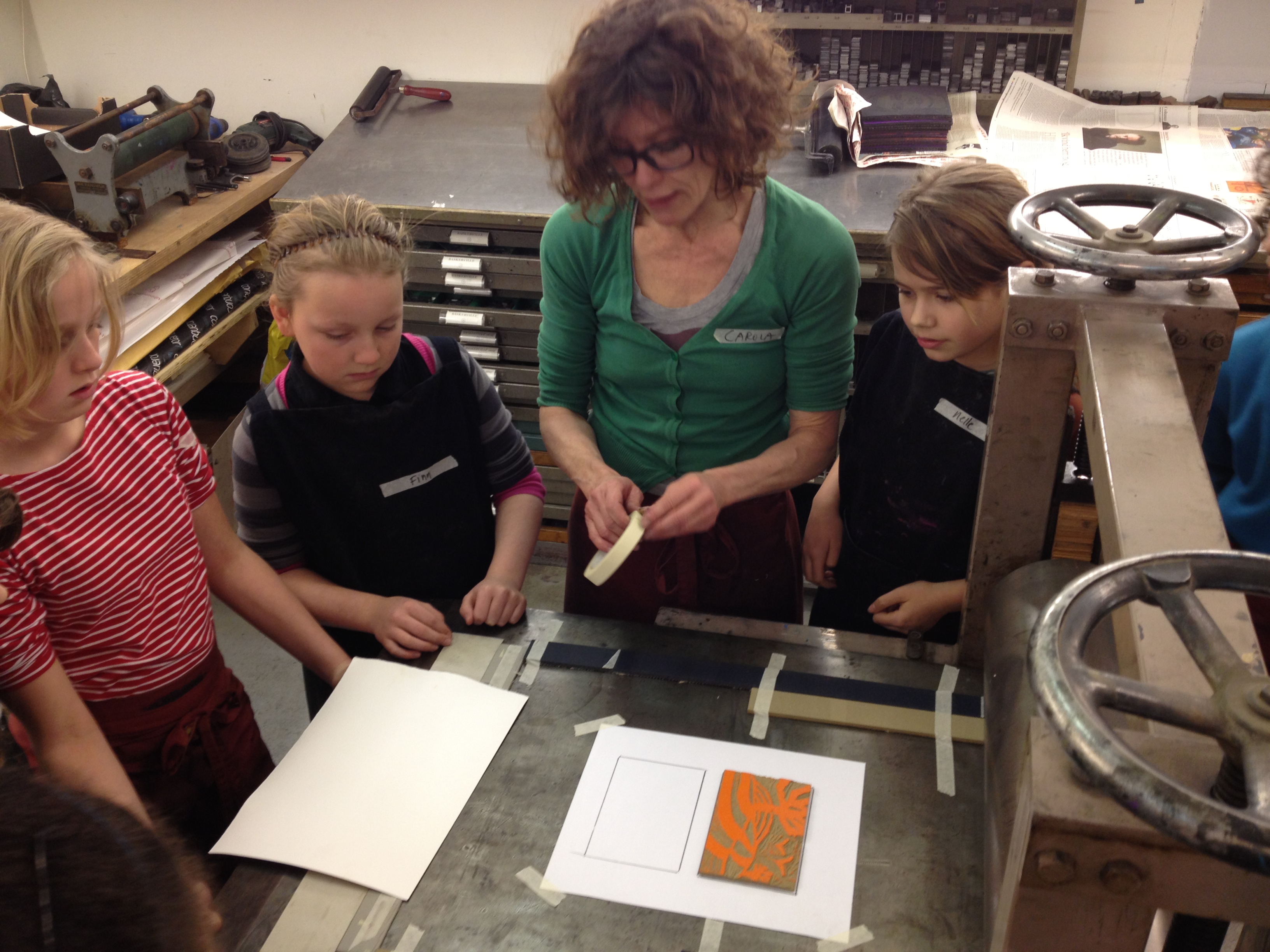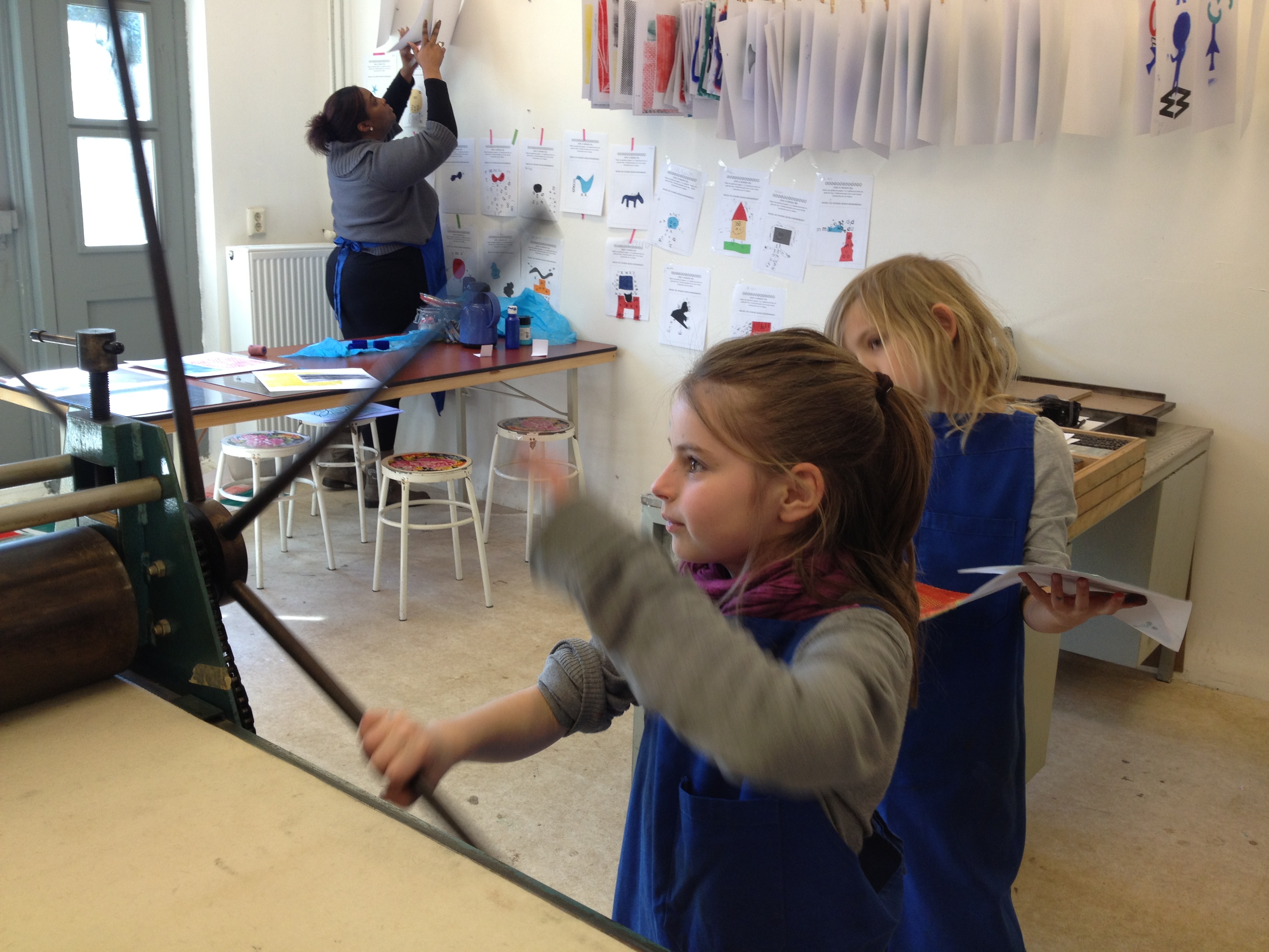 Na 7A vorige week, toog 7B vandaag naar het Grafisch Werkcentrum. Er werd in de voorgaande weken al zeer enthousiast in de klas aan hun persoonlijke linosnedes gewerkt. Vandaag werden ze dan eindelijk afgedrukt onder de persen van het GWA! De hele werkplaats was tot 12 uur hun speelplaats waar volop gerold werd met inkt, gerold werd de persen èn gerold werd met onze ogen! Want wat een verwondering bij iedereen na het bekijken van het resultaat na iedere drukgang. Naast de eigen linosnedes werden er ook prachtige letterbeelden gedrukt. Nu de haiku er nog bij en klaar is het eindwerk.