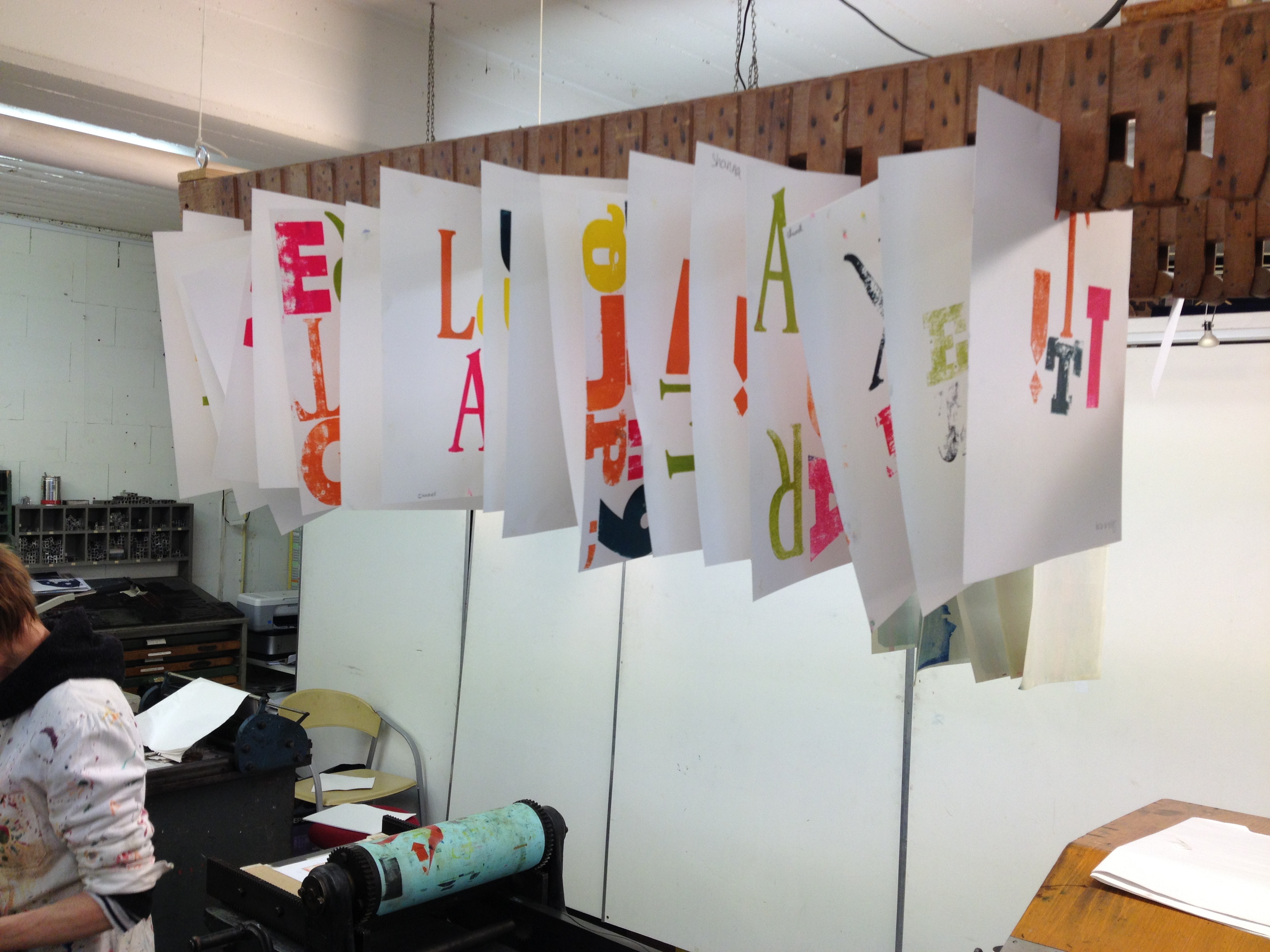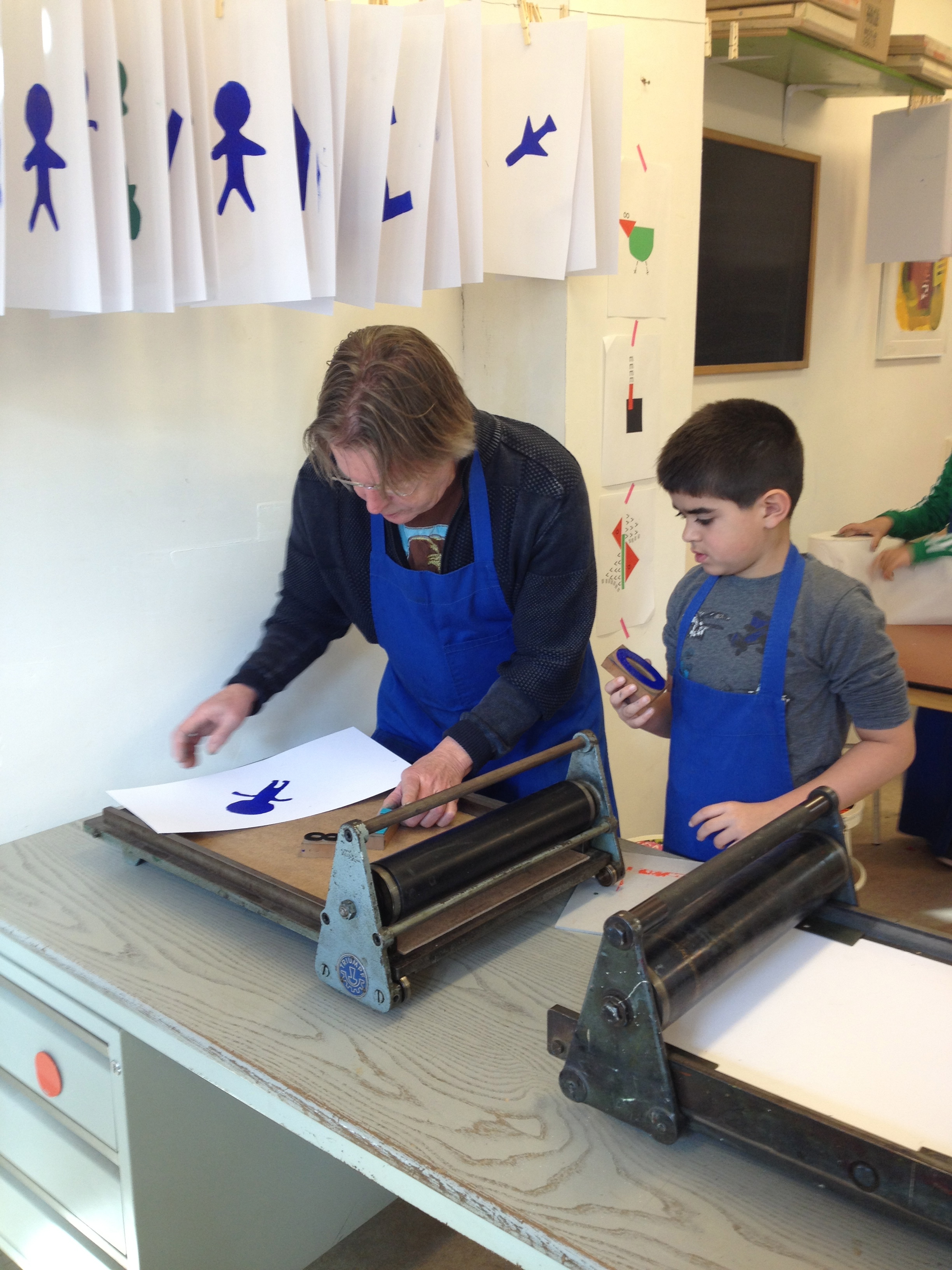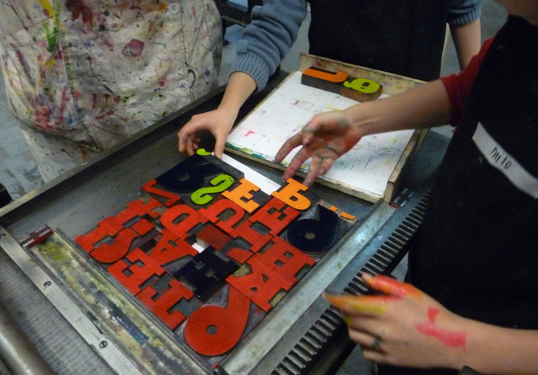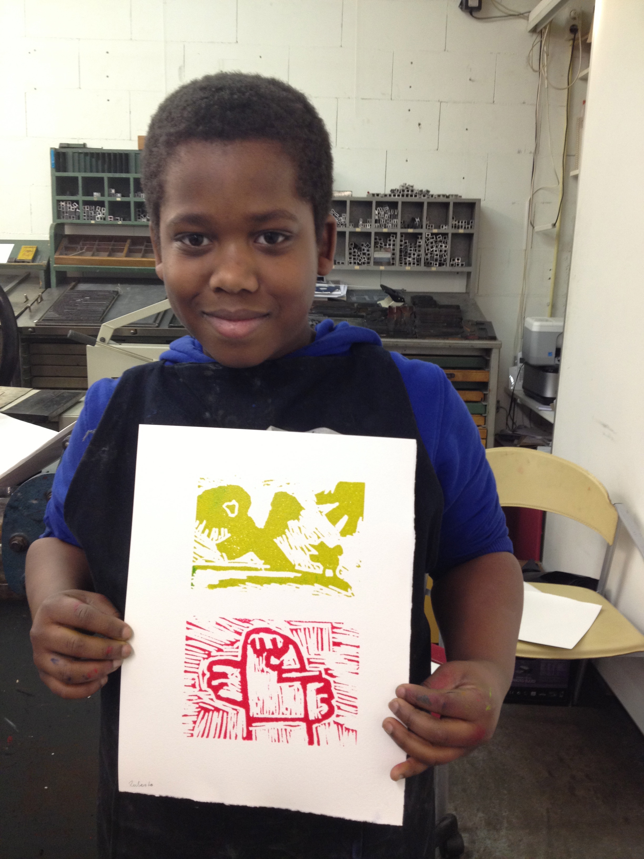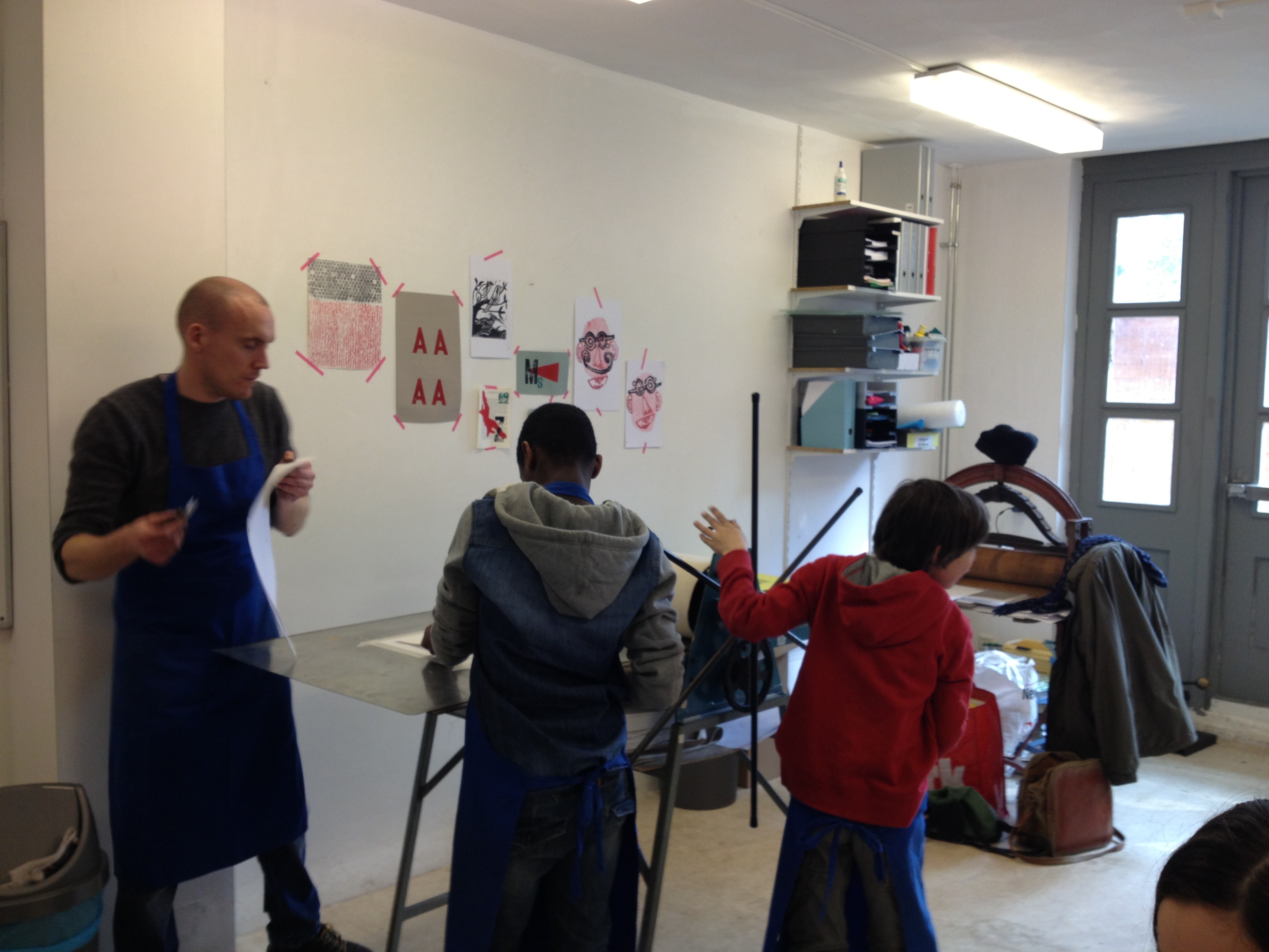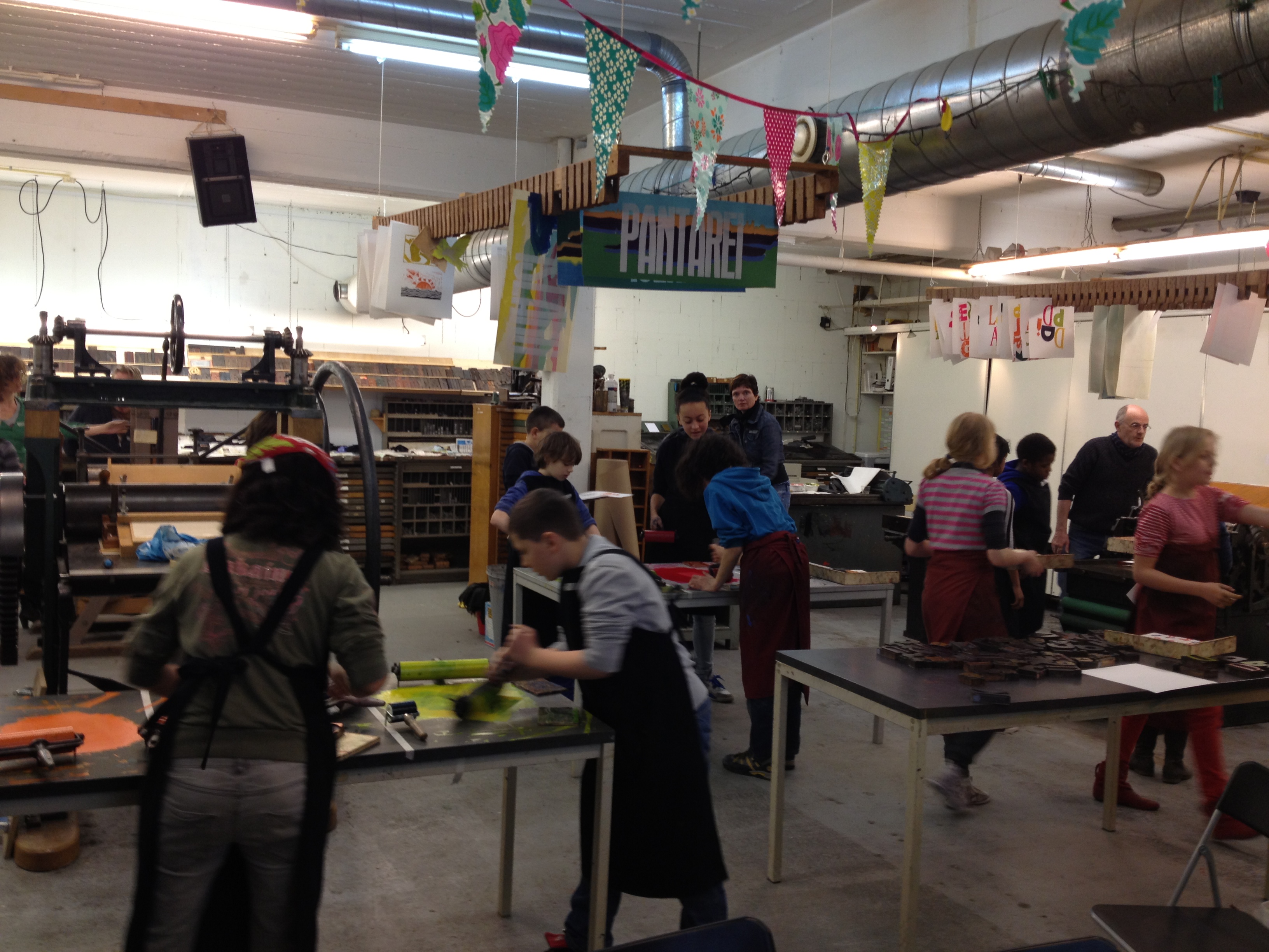 Na 7A vorige week, toog 7B vandaag naar het Grafisch Werkcentrum. Er werd in de voorgaande weken al zeer enthousiast in de klas aan hun persoonlijke linosnedes gewerkt. Vandaag werden ze dan eindelijk afgedrukt onder de persen van het GWA! De hele werkplaats was tot 12 uur hun speelplaats waar volop gerold werd met inkt, gerold werd de persen èn gerold werd met onze ogen! Want wat een verwondering bij iedereen na het bekijken van het resultaat na iedere drukgang. Naast de eigen linosnedes werden er ook prachtige letterbeelden gedrukt. Nu de haiku er nog bij en klaar is het eindwerk.