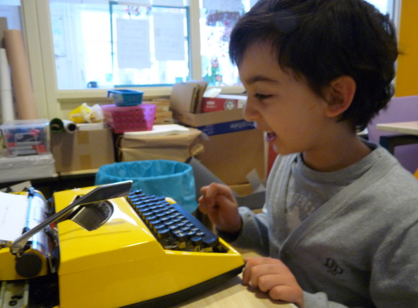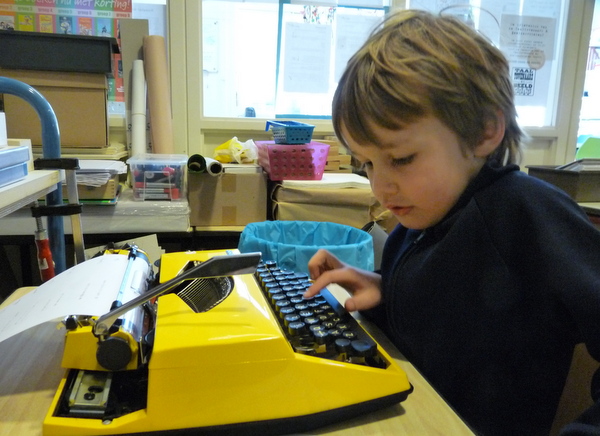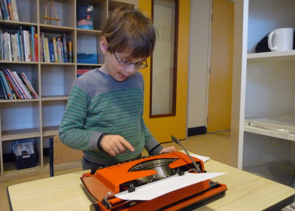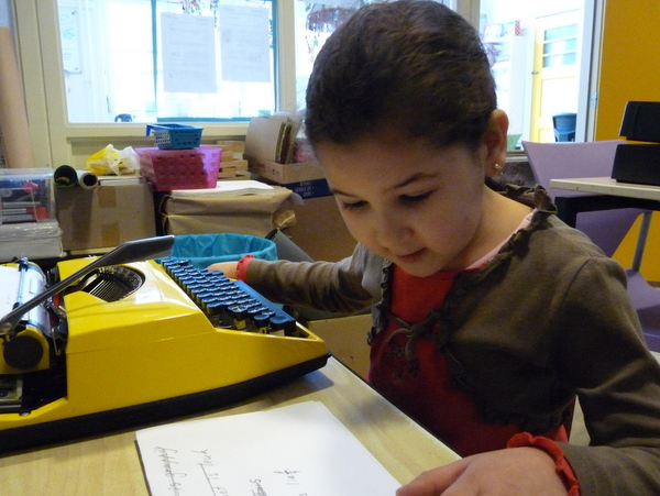 Ja ja, we hebben ze nog op de kop weten te tikken. De echte ouderwetse typemachines. Vanmorgen hebben de typetjes van 3A hun tekst getypt bij hun kartondrukwerk. Dat was even grappig, al die lettertjes op steeltjes! Ze moesten wel hard op de toetsen drukken, anders zag je helemaal niets. Maar…het is gelukt! Echt ambachtelijk werk, hè!