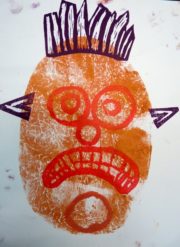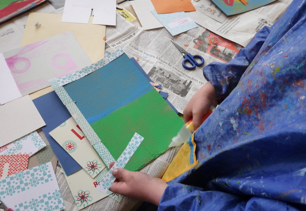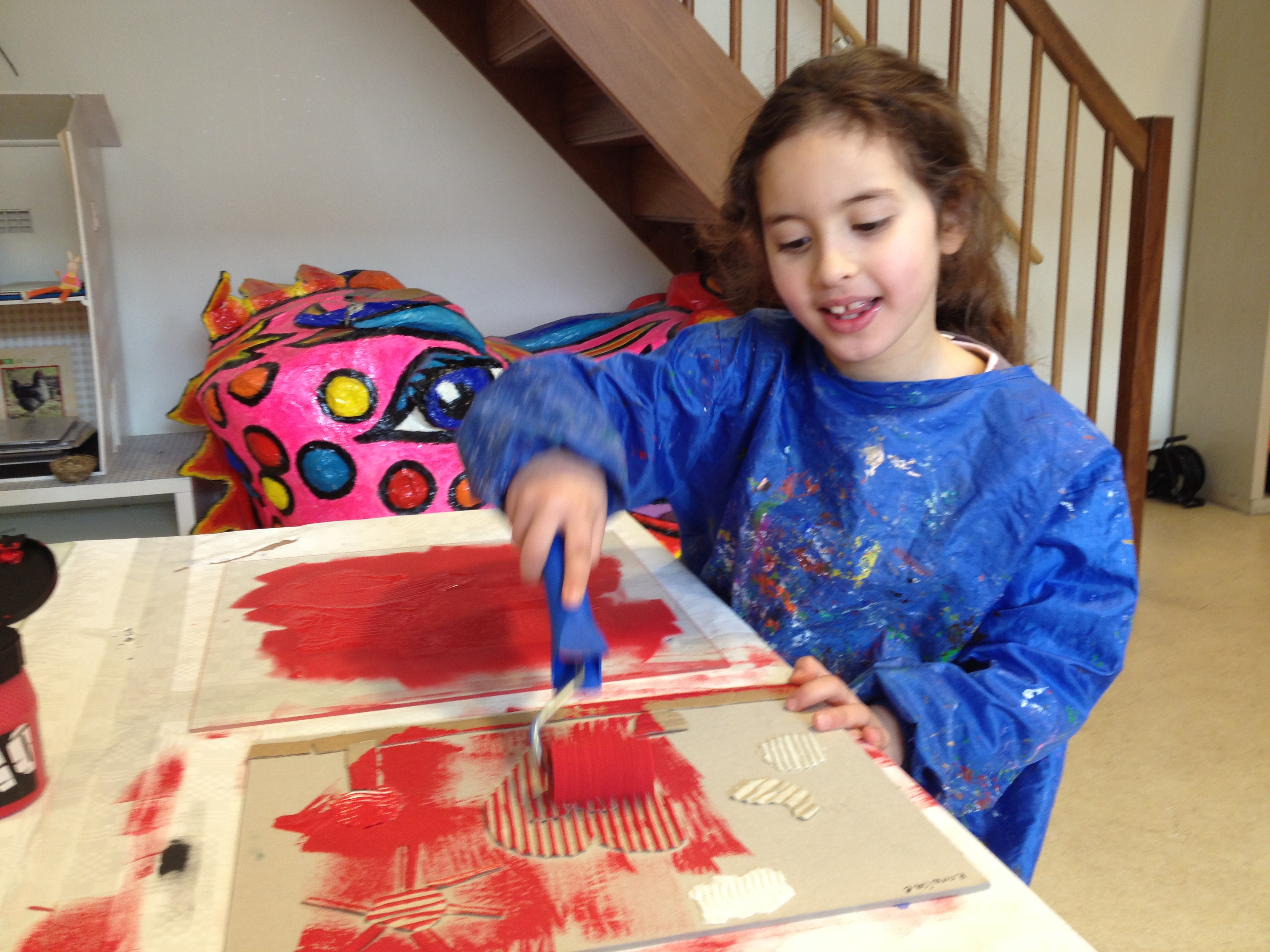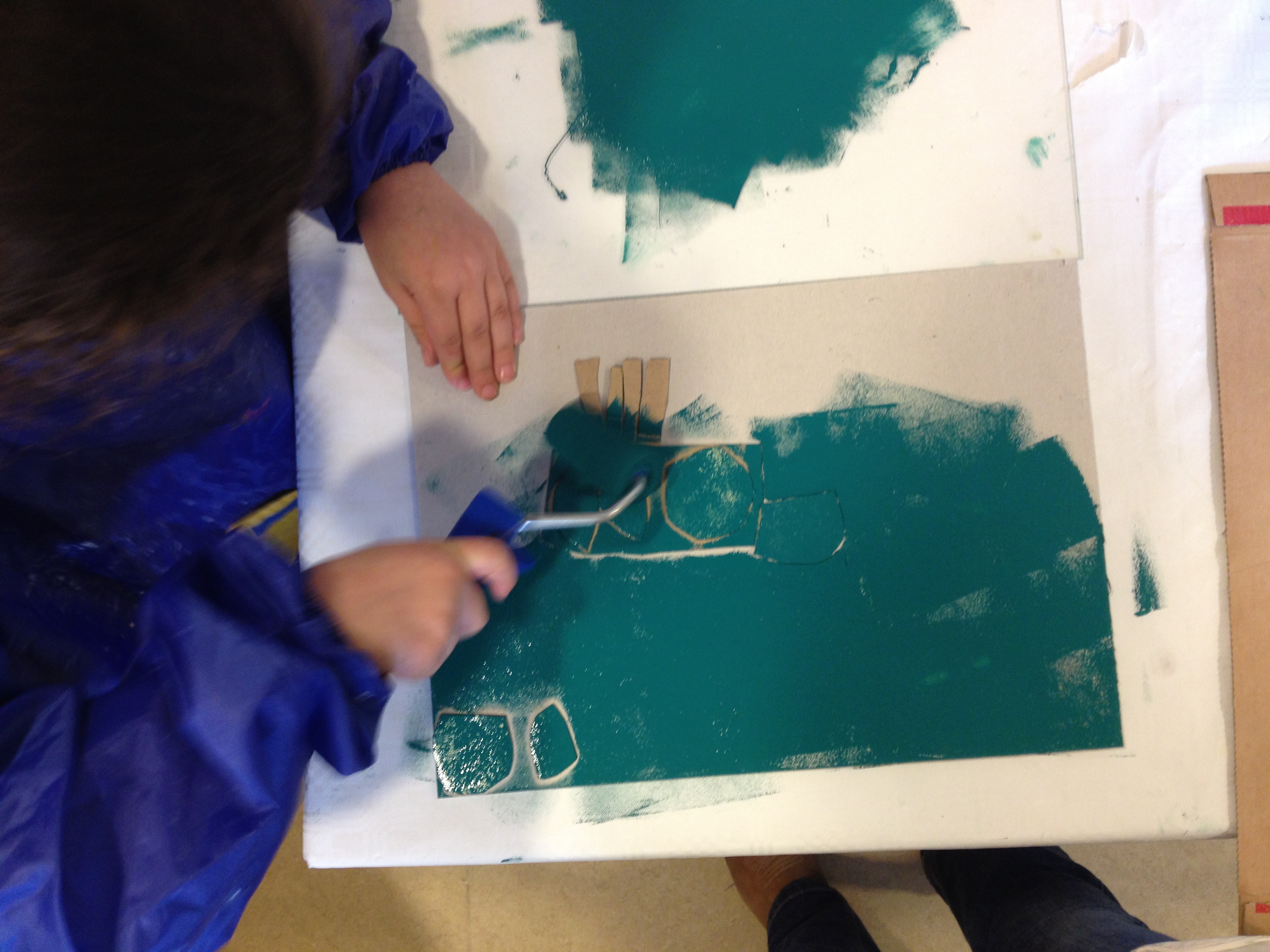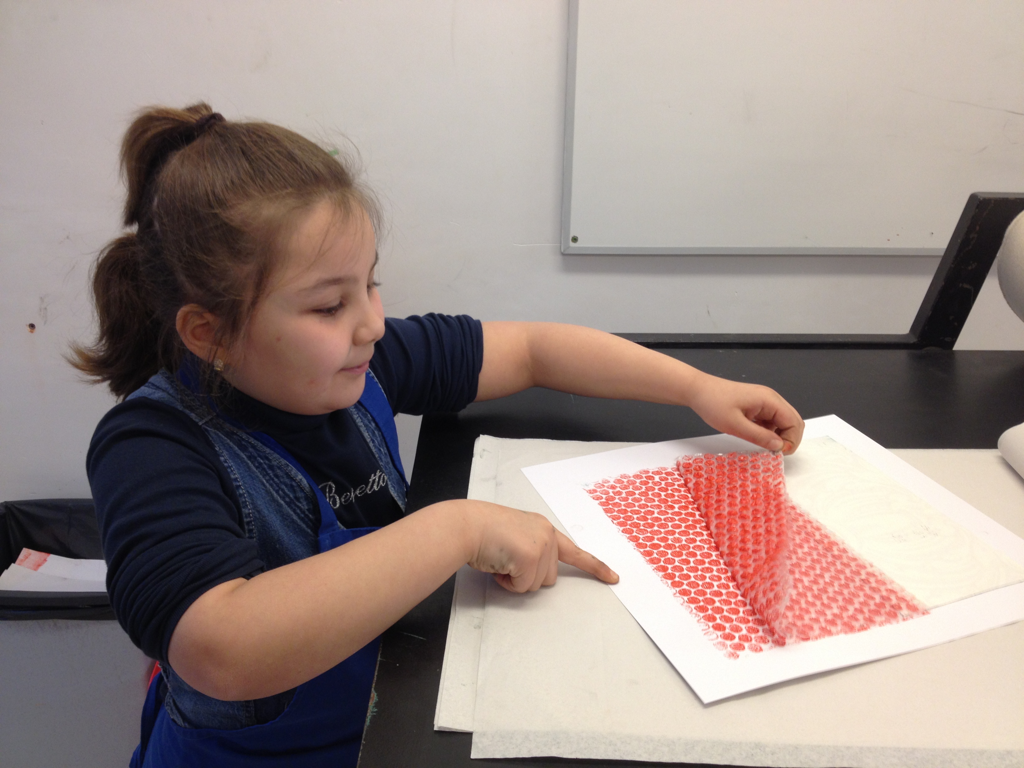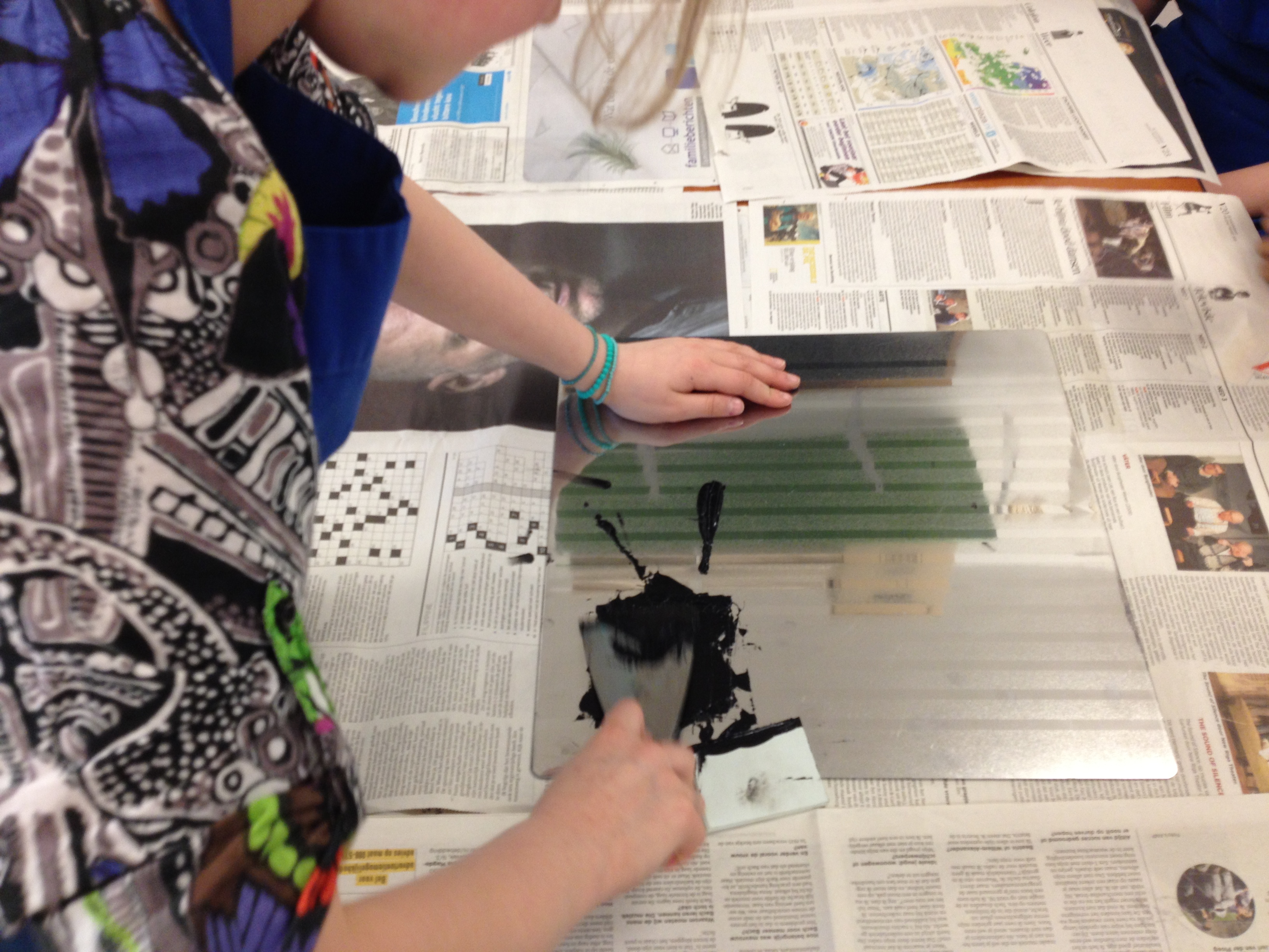 Wat is er lekker gewerkt door 5A met de 2 grote etspersen! Met groot enthousiasme werden er vandaag afdrukken gemaakt van mooi reliëfbehang en bubbeltjesplastic. Vervolgens mocht het reeds voorbereide sjabloon van de vorige les er over gedrukt worden. Alvast een tipje van sluier…het werkje van Khaula, prachtig, niet?