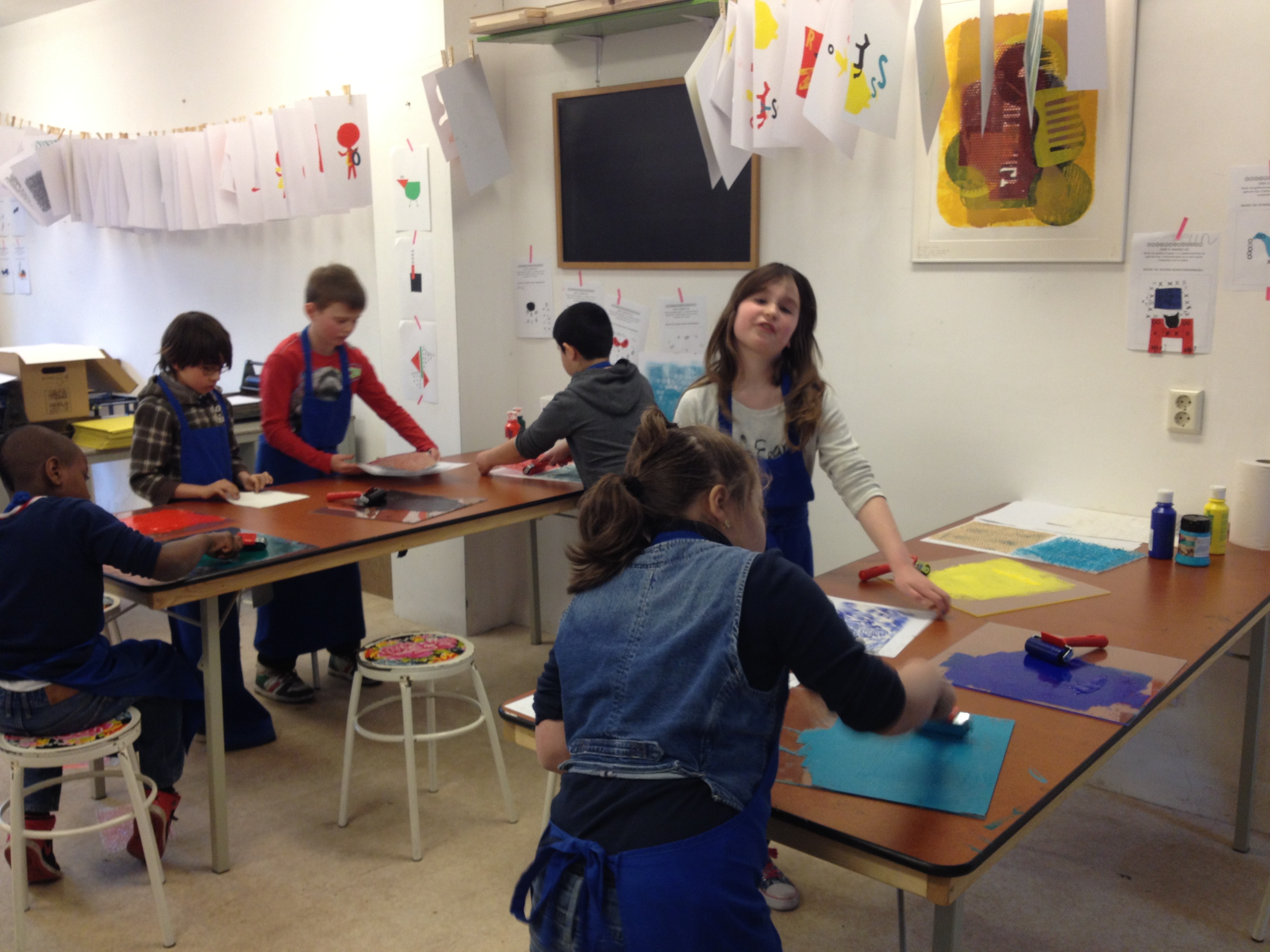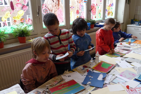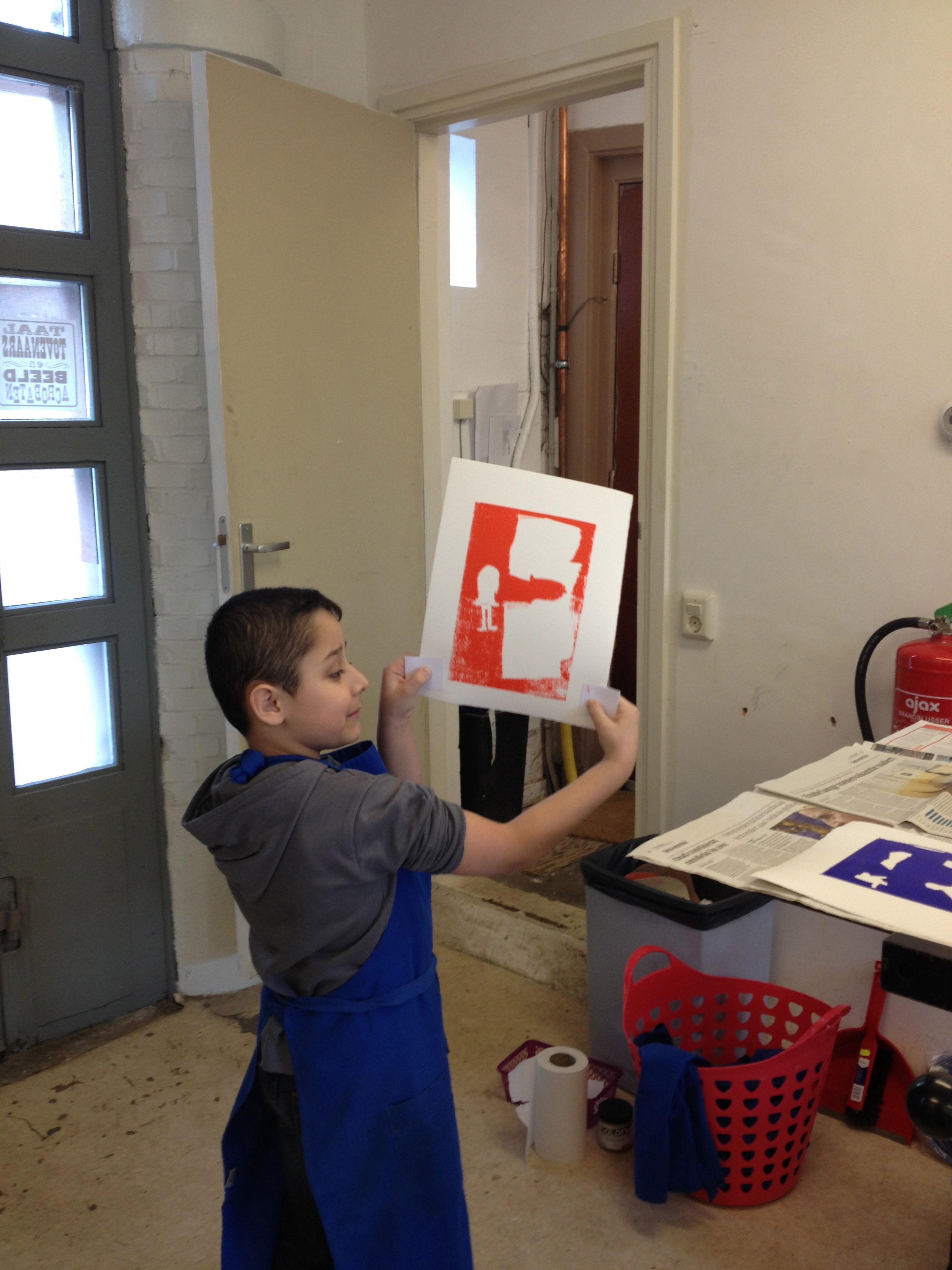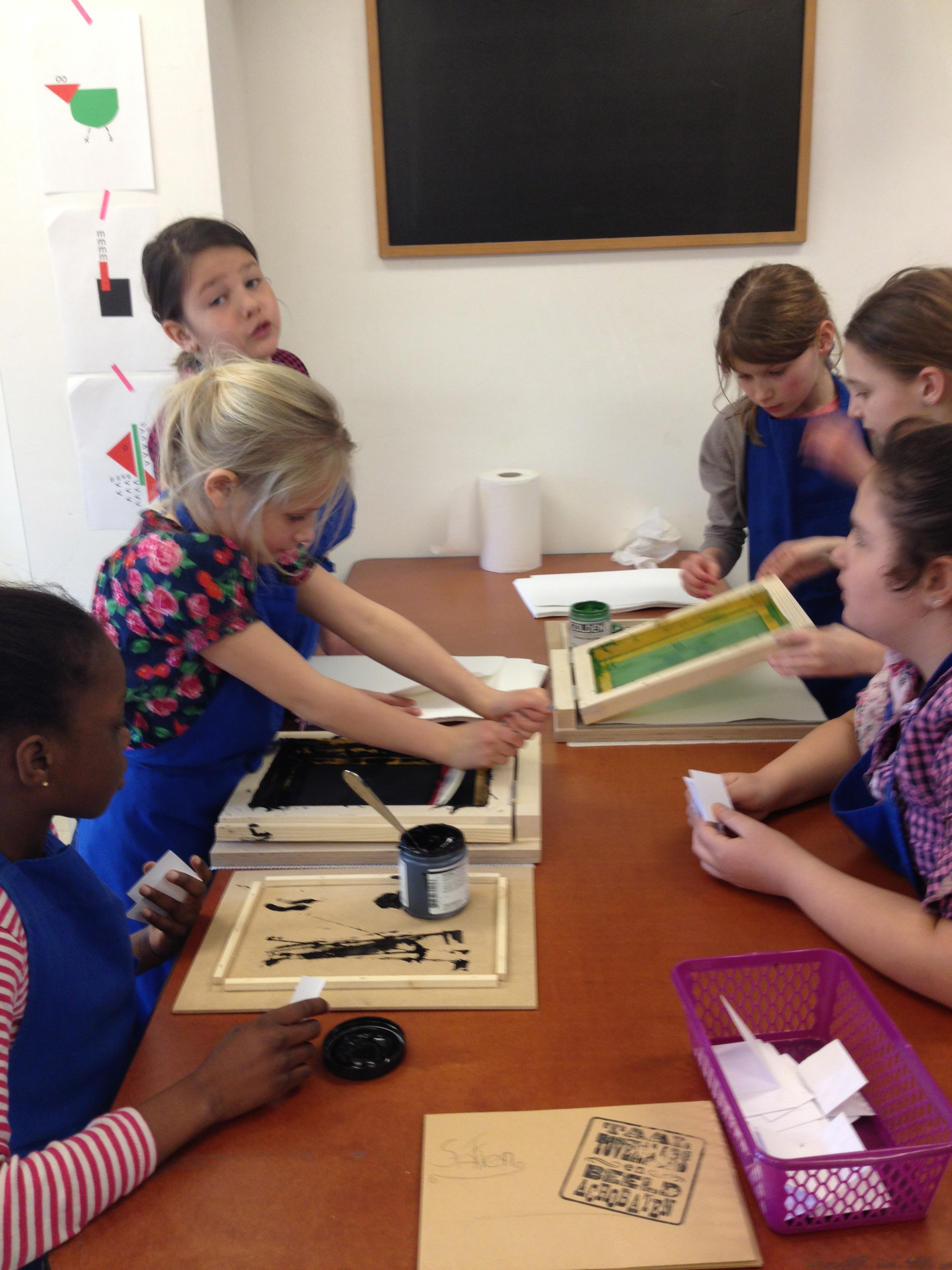 Vanmiddag was het atelier ingericht voor het echte zeefdrukwerk van 5B. De helft van de klas kwam naar de Van Kinsbergenstraat waar ze verdeeld werden in 4 teams. Ieder team bestond uit 3 kinderen met ieder zo zijn taak als papieraangever, drukker of papier”weghaler”. En wat ging dat super! Prachtige werkjes kwamen er onder de raampjes vandaan. Na afloop werd er nog een klein sjabloon gemaakt voor de volgende les. Na de paasdagen mag de andere helft van de klas komen zeefdrukken.