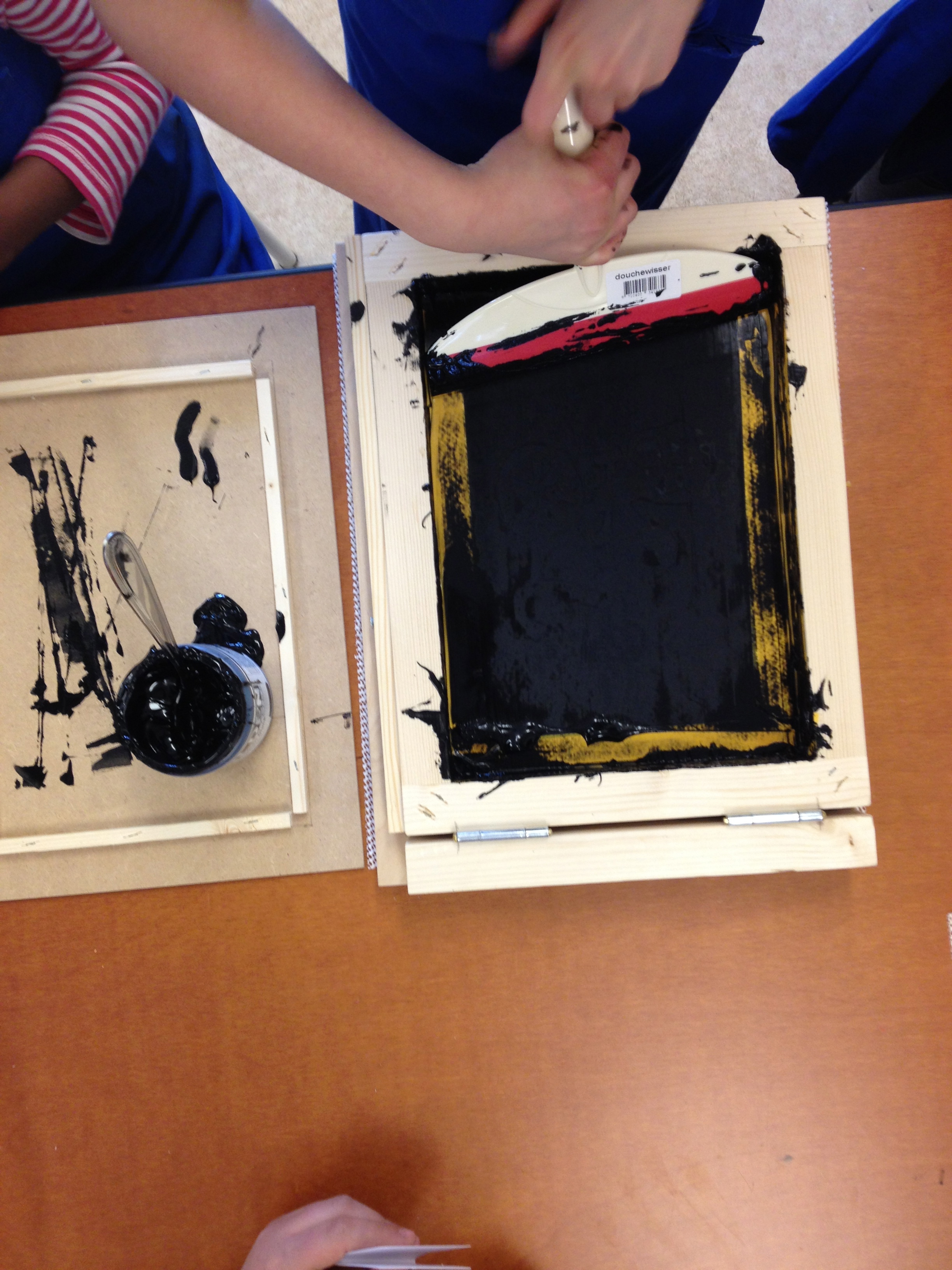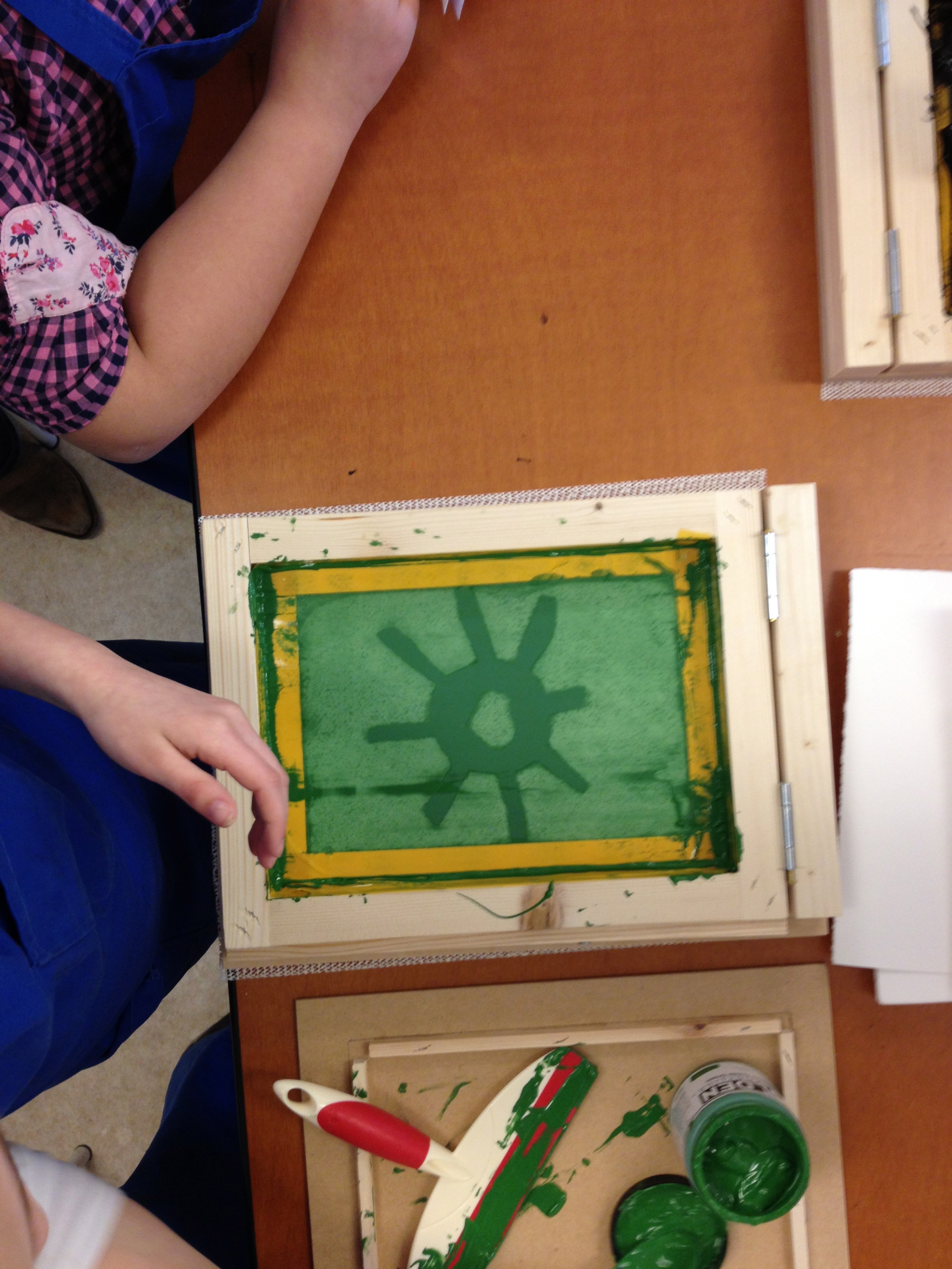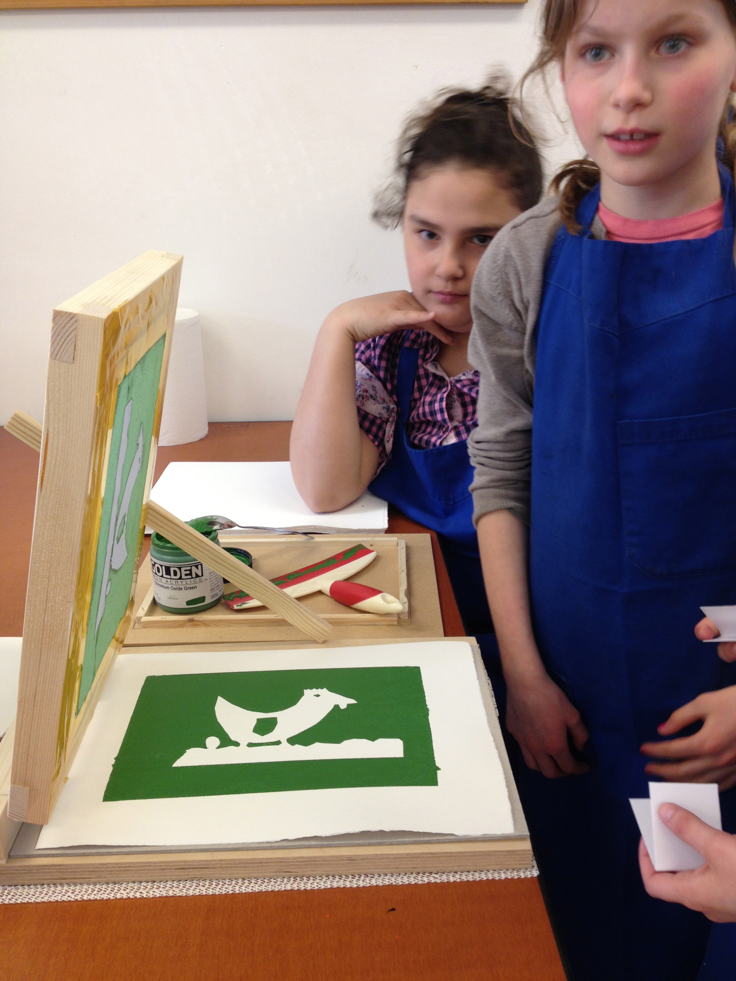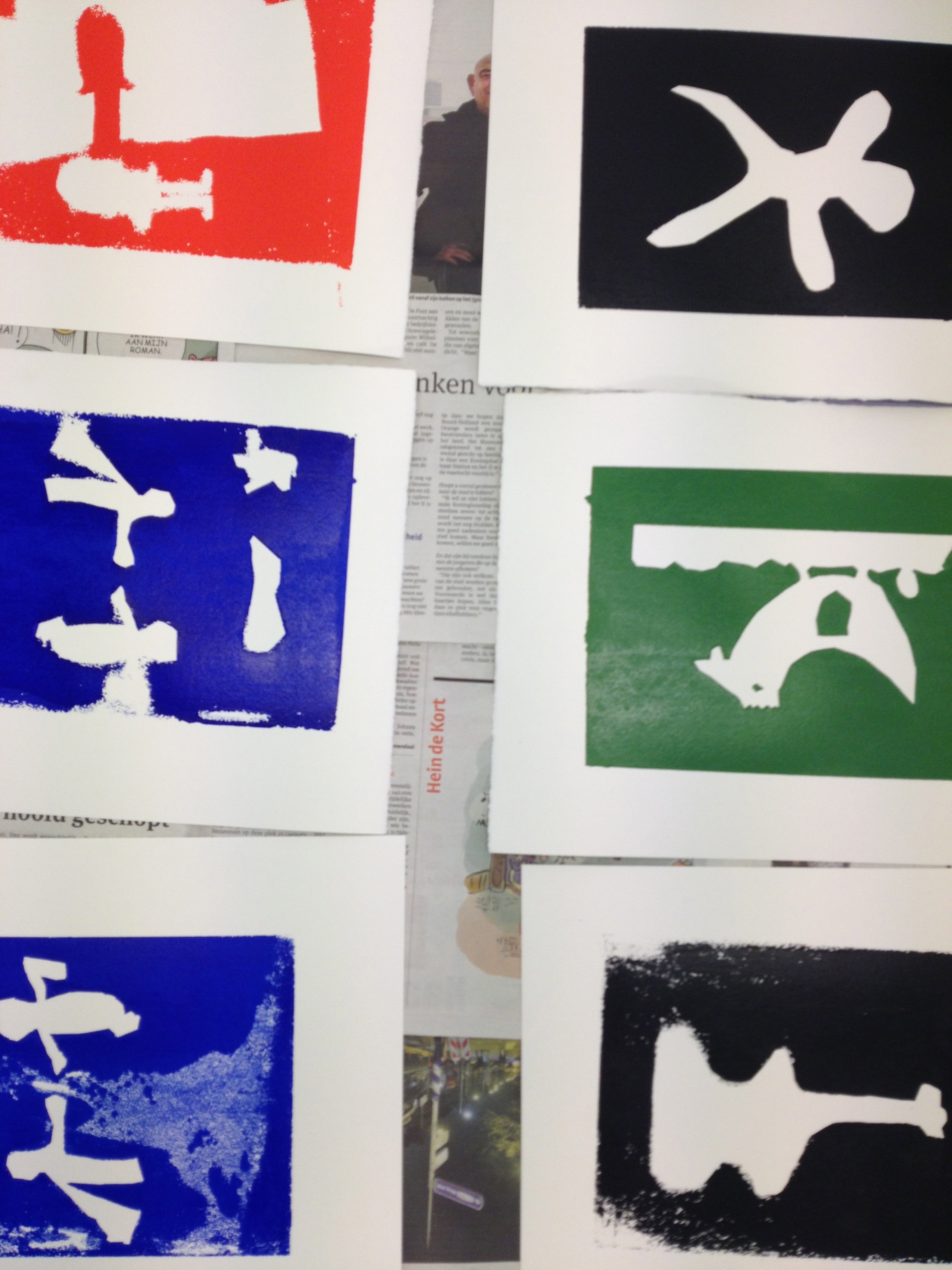 Vanmiddag was het atelier ingericht voor het echte zeefdrukwerk van 5B. De helft van de klas kwam naar de Van Kinsbergenstraat waar ze verdeeld werden in 4 teams. Ieder team bestond uit 3 kinderen met ieder zo zijn taak als papieraangever, drukker of papier”weghaler”. En wat ging dat super! Prachtige werkjes kwamen er onder de raampjes vandaan. Na afloop werd er nog een klein sjabloon gemaakt voor de volgende les. Na de paasdagen mag de andere helft van de klas komen zeefdrukken.