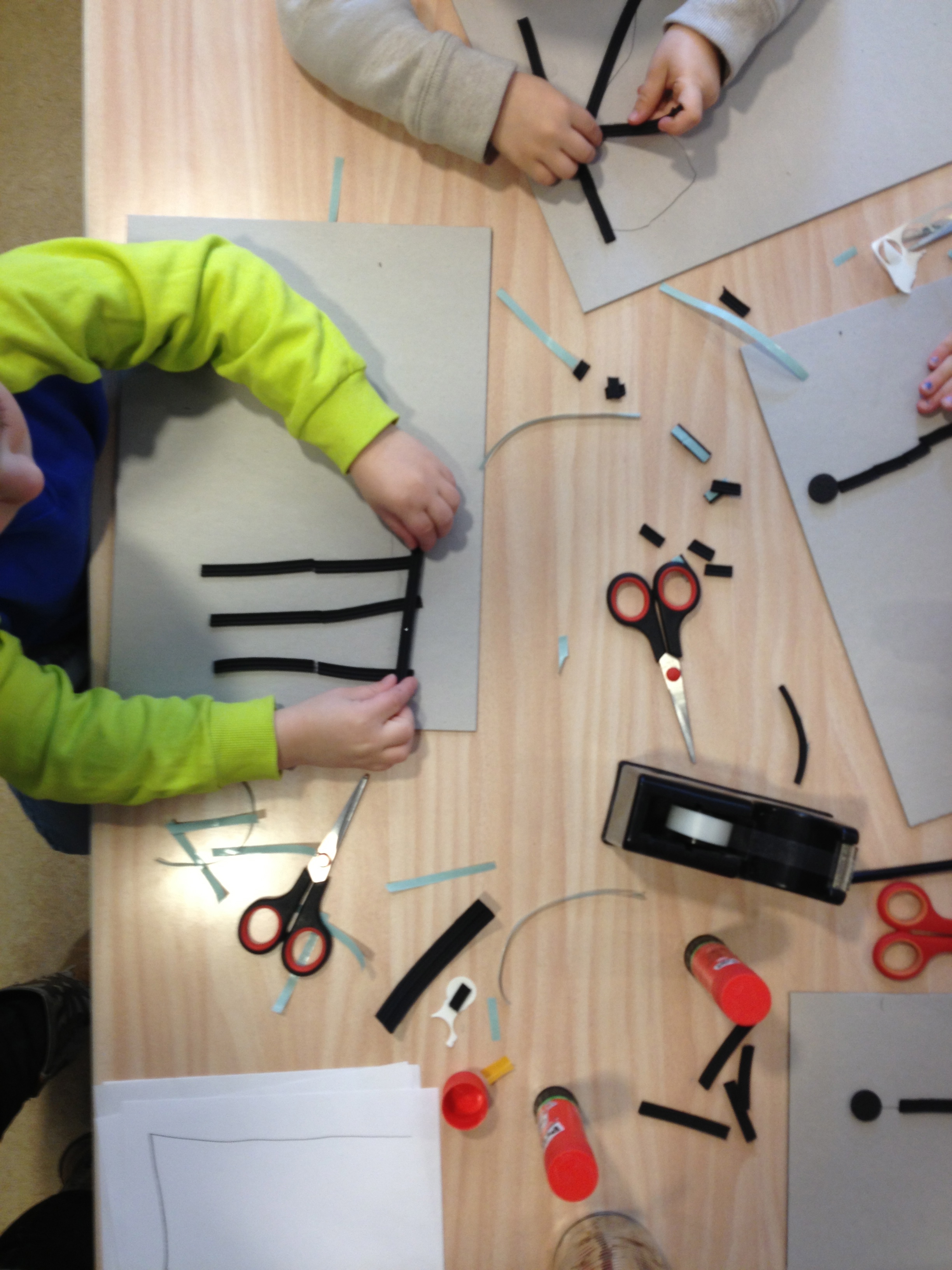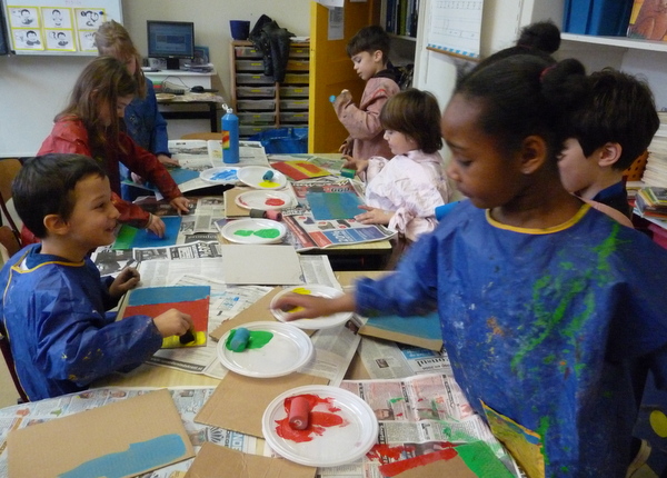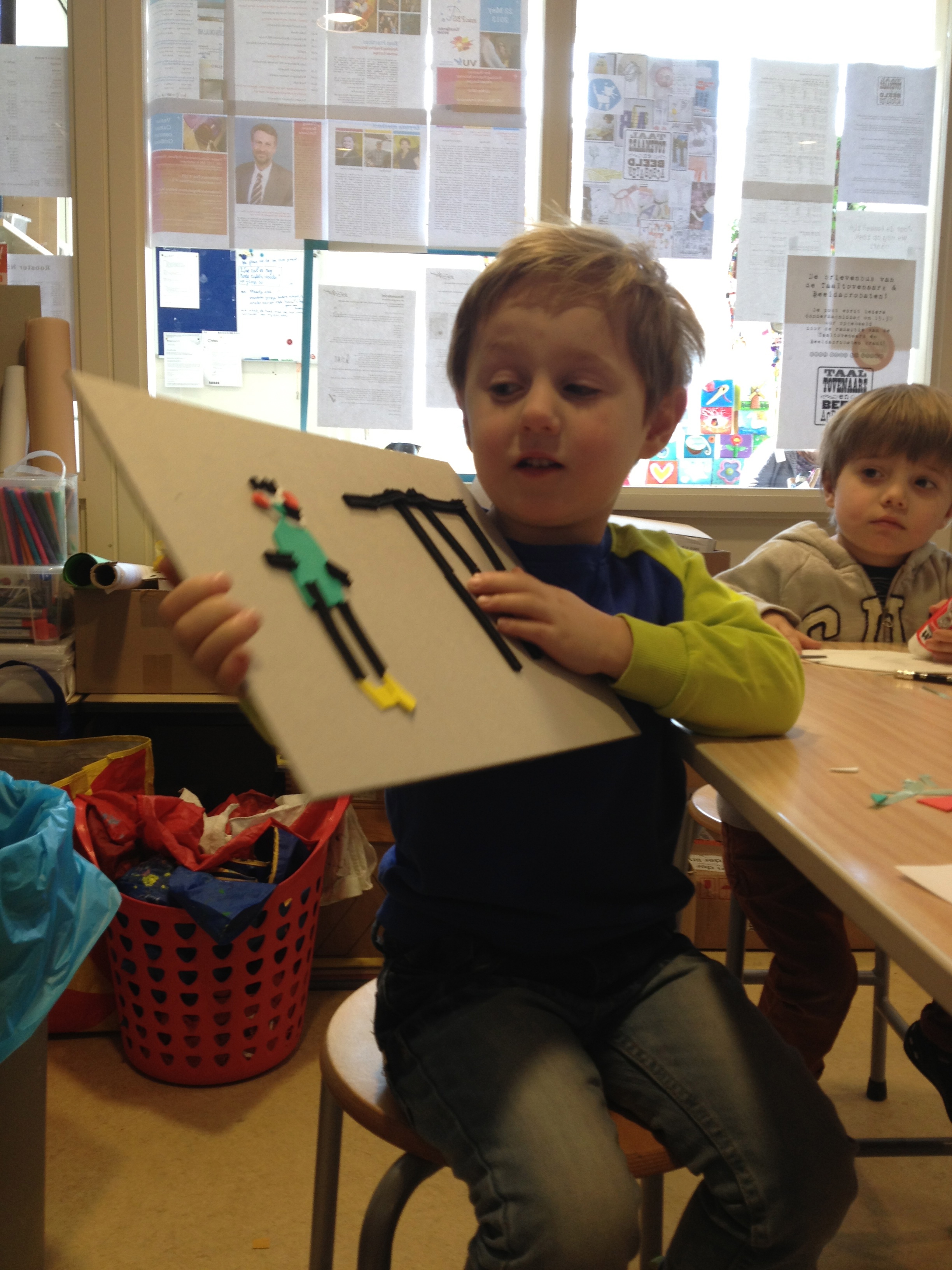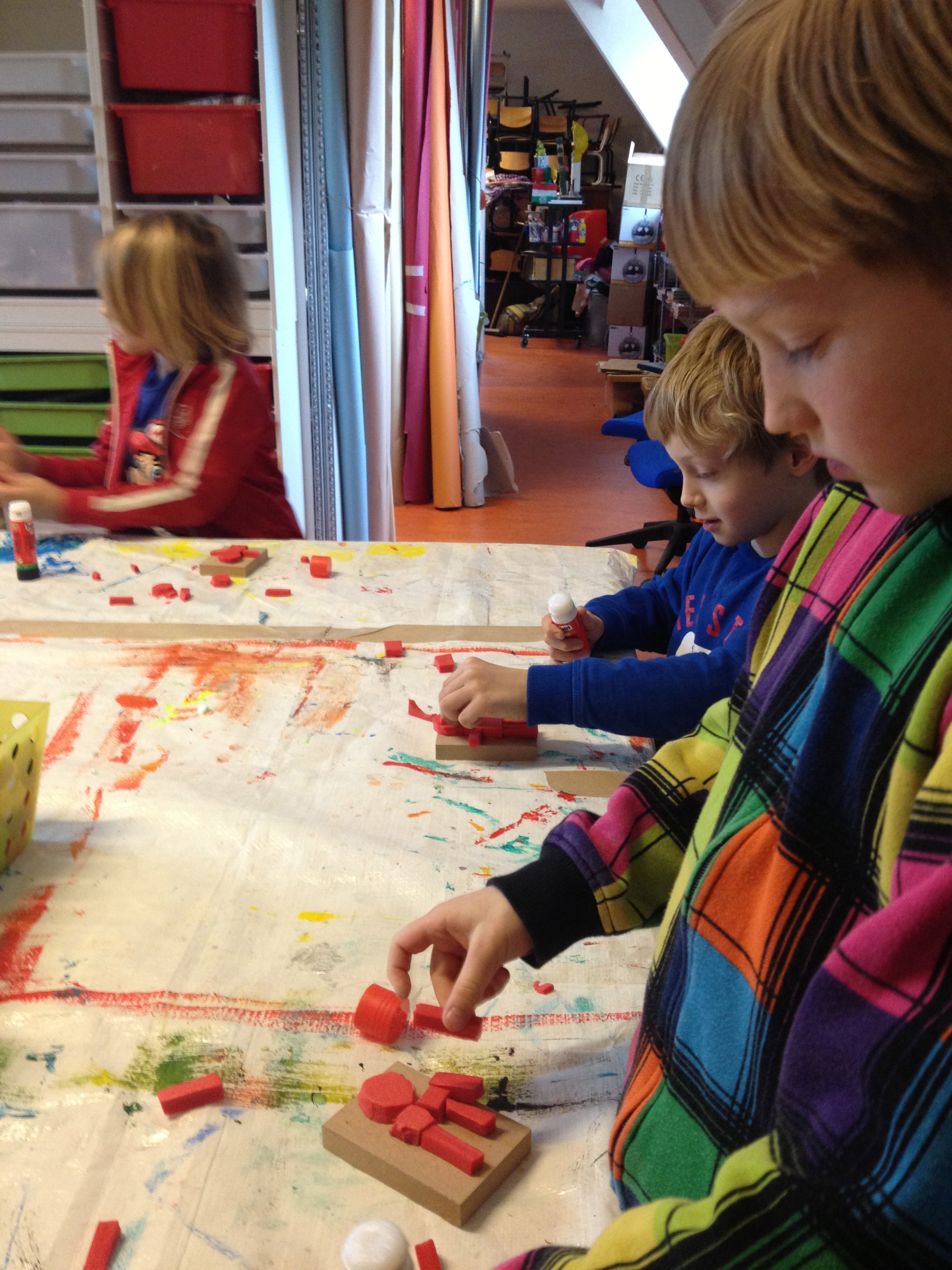 Vanmiddag was het atelier ingericht voor het echte zeefdrukwerk van 5B. De helft van de klas kwam naar de Van Kinsbergenstraat waar ze verdeeld werden in 4 teams. Ieder team bestond uit 3 kinderen met ieder zo zijn taak als papieraangever, drukker of papier”weghaler”. En wat ging dat super! Prachtige werkjes kwamen er onder de raampjes vandaan. Na afloop werd er nog een klein sjabloon gemaakt voor de volgende les. Na de paasdagen mag de andere helft van de klas komen zeefdrukken.
