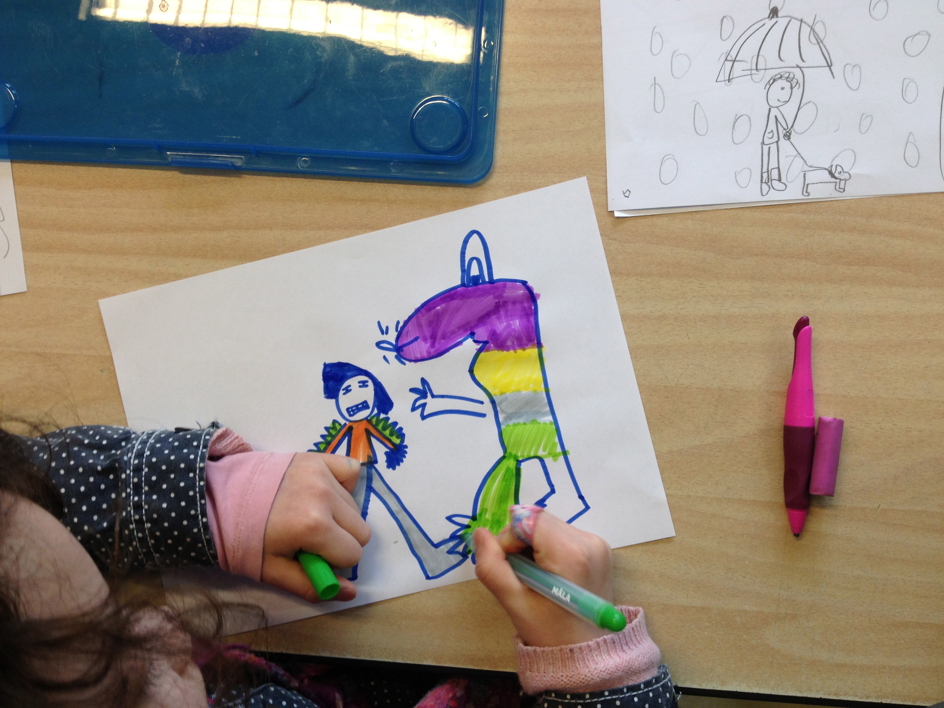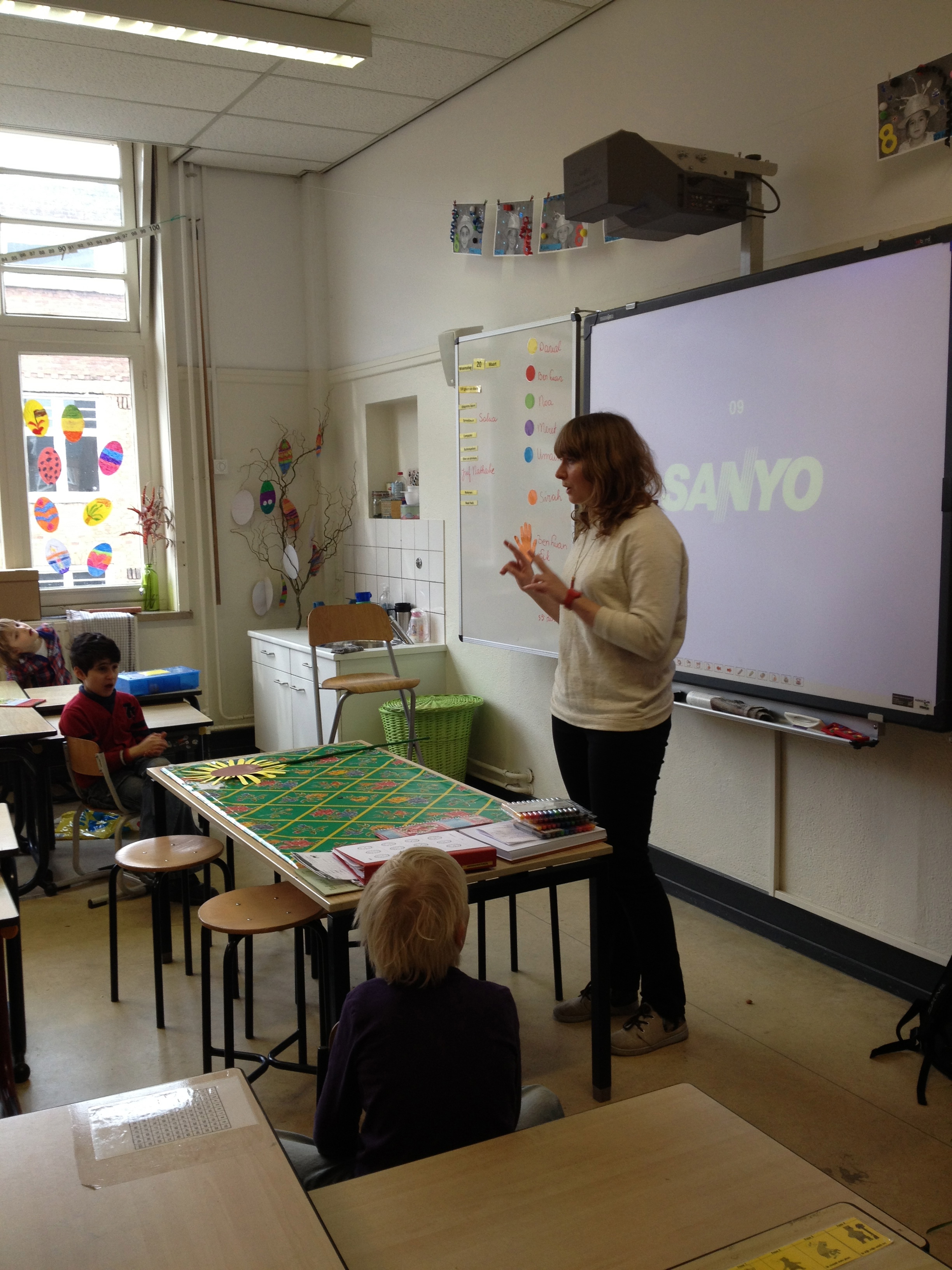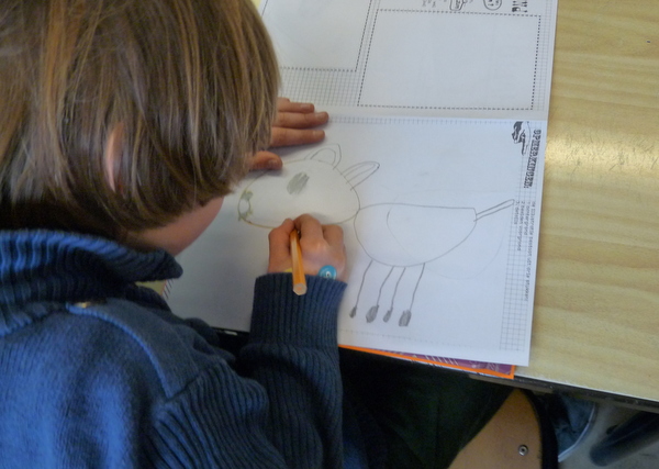 Vandaag kreeg groep 4A bezoek van een echte illustratrice! Iris Deppe maakt de mooiste illustraties en daar hield ze een leuke presentatie over. Jammer genoeg liet de techniek ons even in de steek en konden we haar mooie illustraties niet zien op het digibord, maar vanaf haar laptop ging het ook prima. Samen keken we naar een clipje ” Big blue monsters” van het bandje Hummingville waarvoor Iris de tekeningen maakte. Wauw! Dat vond iedereen prachtig! Daarna werd er getekend. 2 leuke tekendictee’s maakte de klas en ook las Iris voor uit het boekje “In het pikkedonker” van Kitty Crowther. “Waar zijn de kinderen uit 4B wel eens bang voor? “, wilde Iris weten. Nou, er waren zat kinderen die daar wat over konden vertellen! De klas mocht tot slot een monster tekenen waarvoor ze bang waren en daarnaast eentje die hen tegen dit monster zou beschermen. Dank je wel Iris, voor de leuke ochtend!