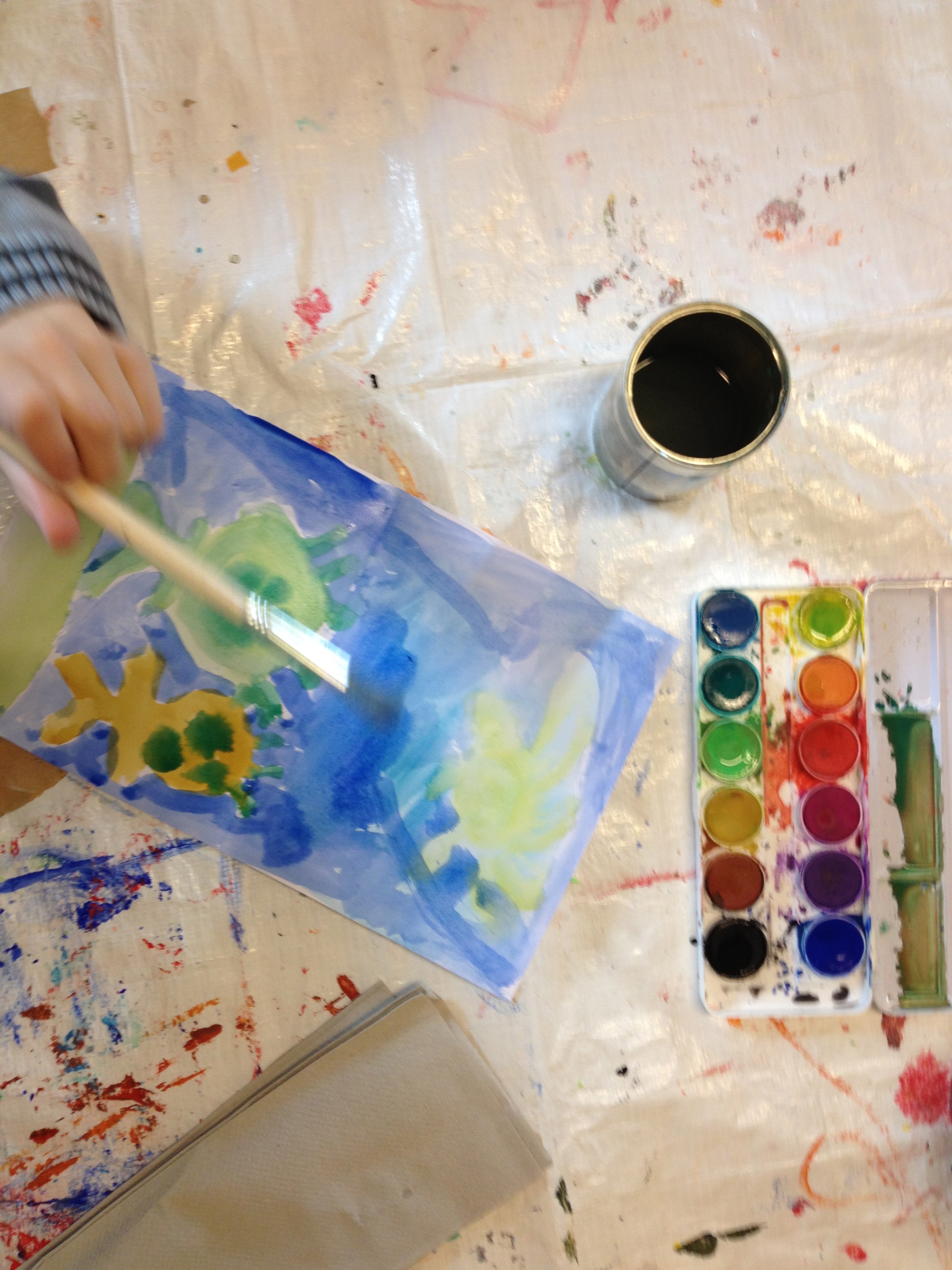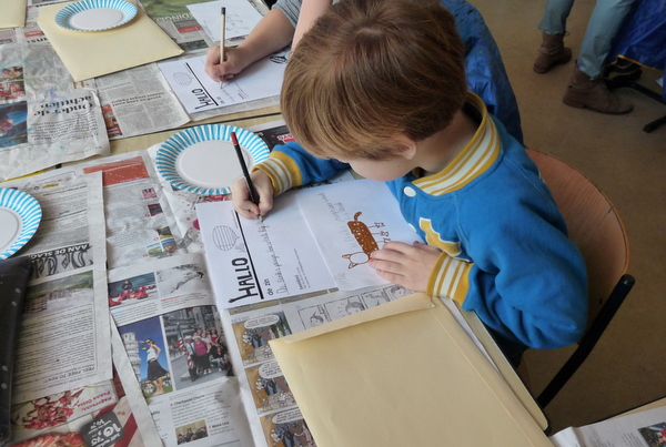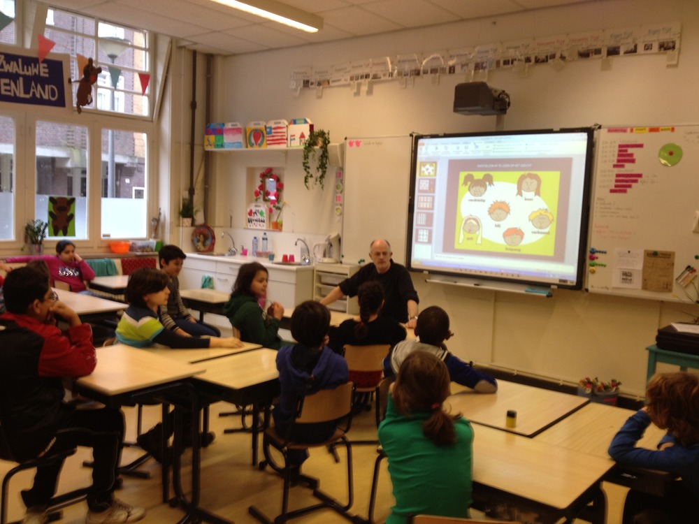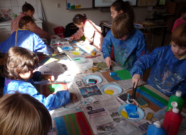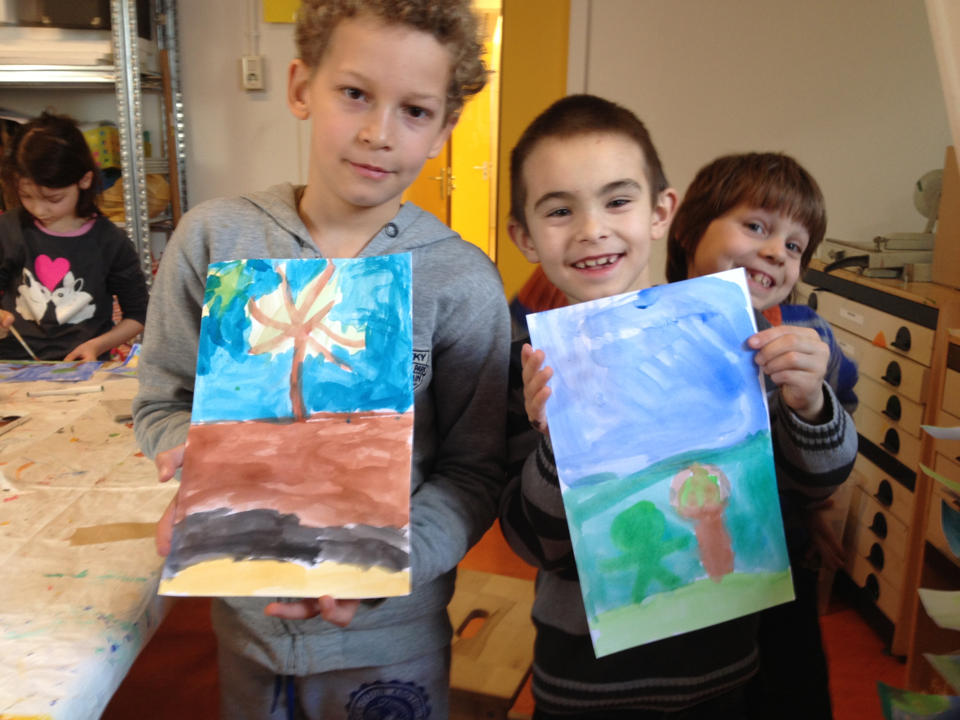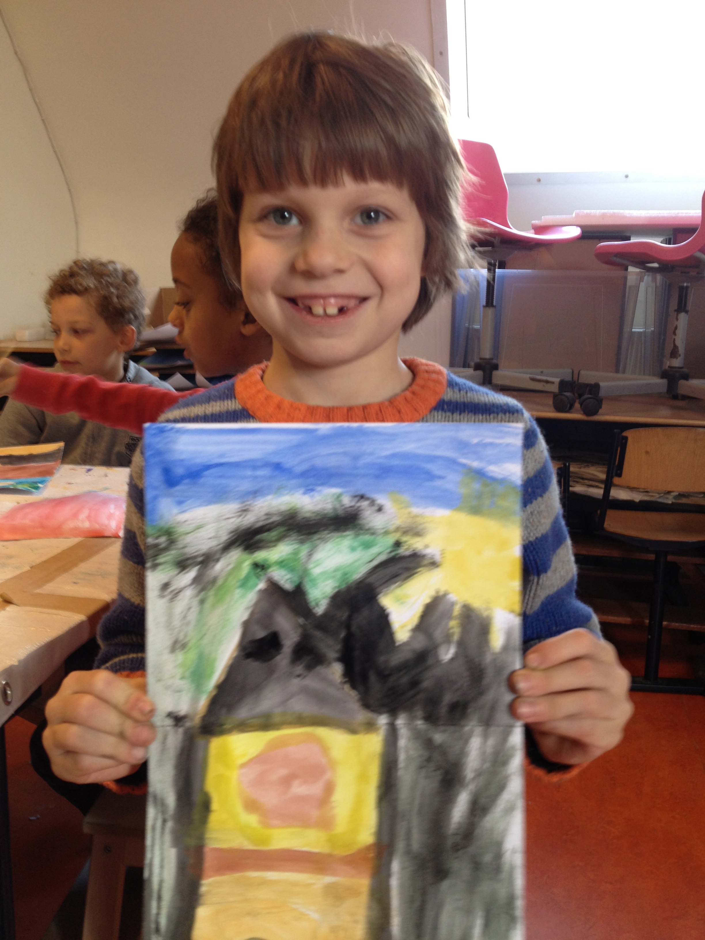 Groep 4A heeft vandaag de eerste 2 pagina’s van hun eigen pop-up boek gemaakt. Met waterverf werden landschappen geschilderd. Er kwamen spontaan hele goede ideeën op bij de kinderen….mooie titels voor het boek….Eik: “Ik wil een sprookje schrijven!”….Over 2 weken werken we verder en dan neemt iedereen ook een pop-up boek van thuis mee om eens even goed te bekijken hoe zo’n boek er nu uitziet!