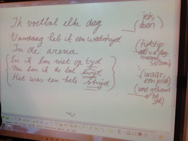 Het Taaltovenaars en Beeldacrobaten schrijflab kwam ook langs bij groep 8. Met de hele groep werden er herinneringen opgehaald aan een bijzondere dag, waarvan vervolgens een lijst werd gemaakt op het bord. Daarna ging ieder voor zich aan de gang met het maken van een woordenlijst of woordweb. Zo had ieder een mooie lijst woorden waaruit geput kon worden bij het schrijven van een 8-regelig gedicht (een rondeel)later in de les. Daar kwamen een paar prachtige, ontroerende verhalen uit. Goed gedaan, groep 8!