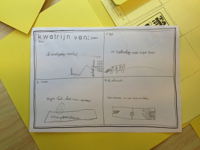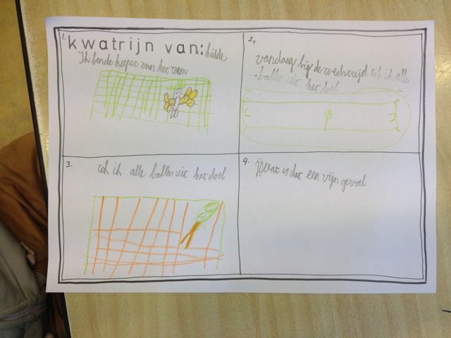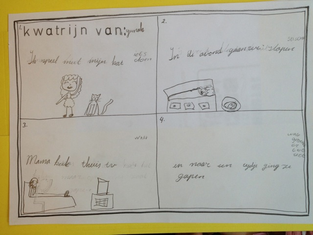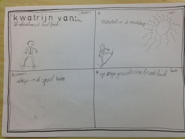 Groep 5b had een lastiger klus te klaren met het schrijven van een kwatrijn. Met de hele klas maakten we er eerst samen eentje en daarna ging ieder zelf aan de slag. Pittige klus op het laatste uur van een lange schooldag, maar iedereen deed enorm zijn best. Zie hier wat voorbeelden van hun harde werken.