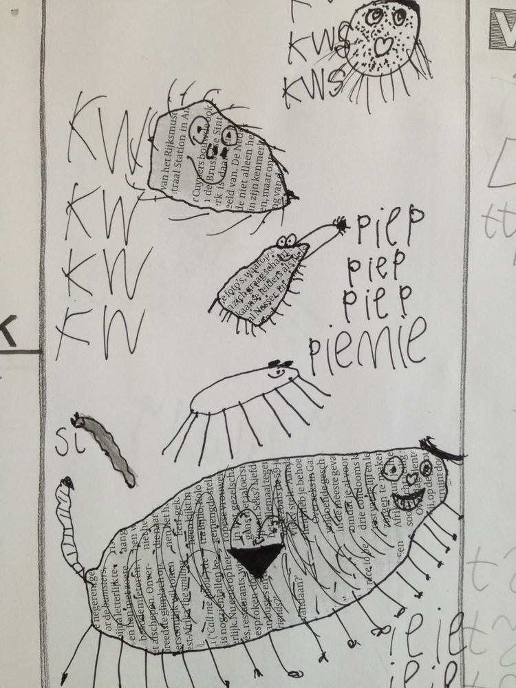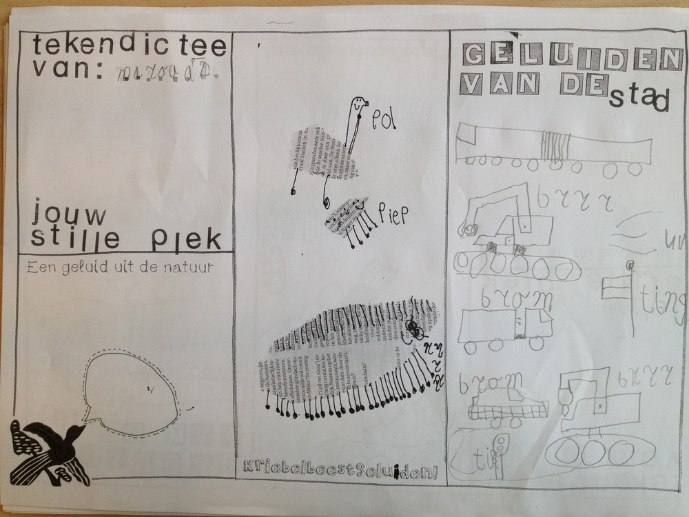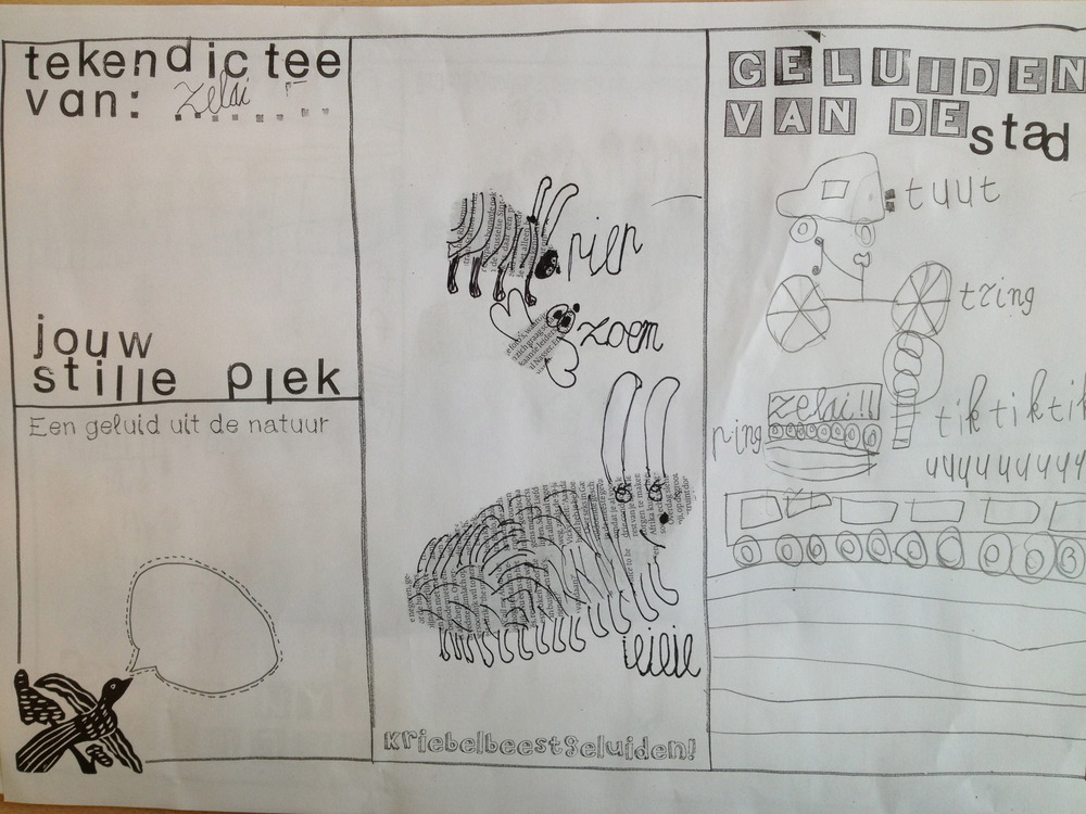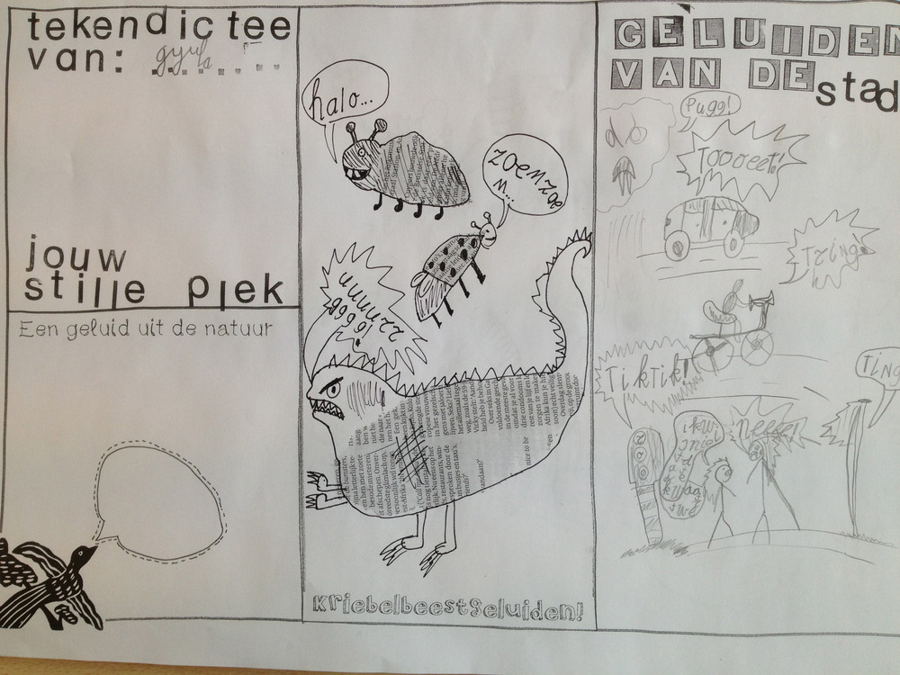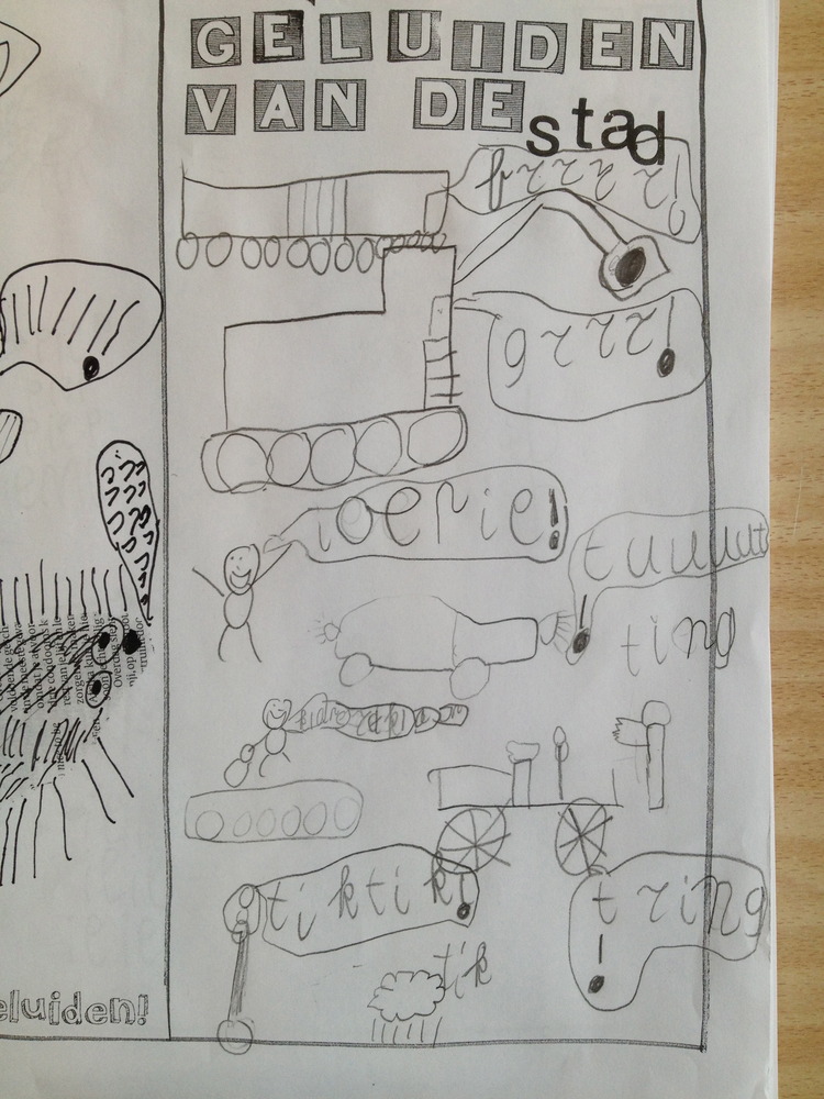 Daarna tekenden we ook grappige fantasiekriebelbeesten en mocht iedereen er zijn eigen kriebelbeestjespraat bij verzinnen. Een paar kinderen presenteerden hun beestjes voor de groepen en lieten hun klanken horen. Volgende week gaan we beginnen aan het drukken van de stad en het maken van eigen stadsgeluidenstempels!