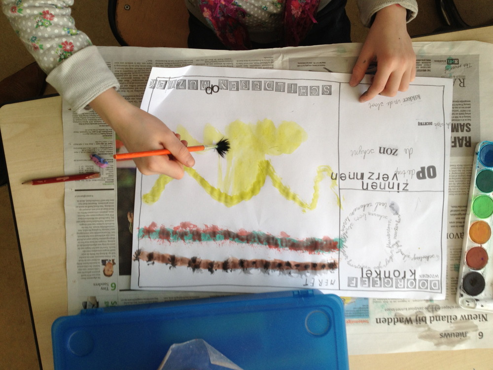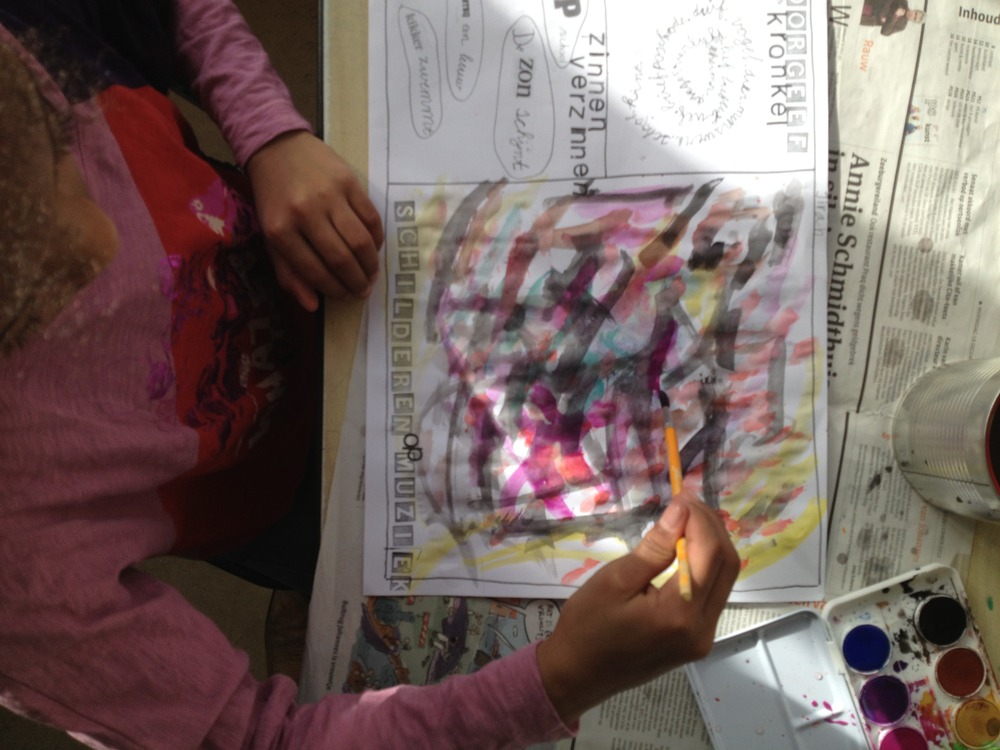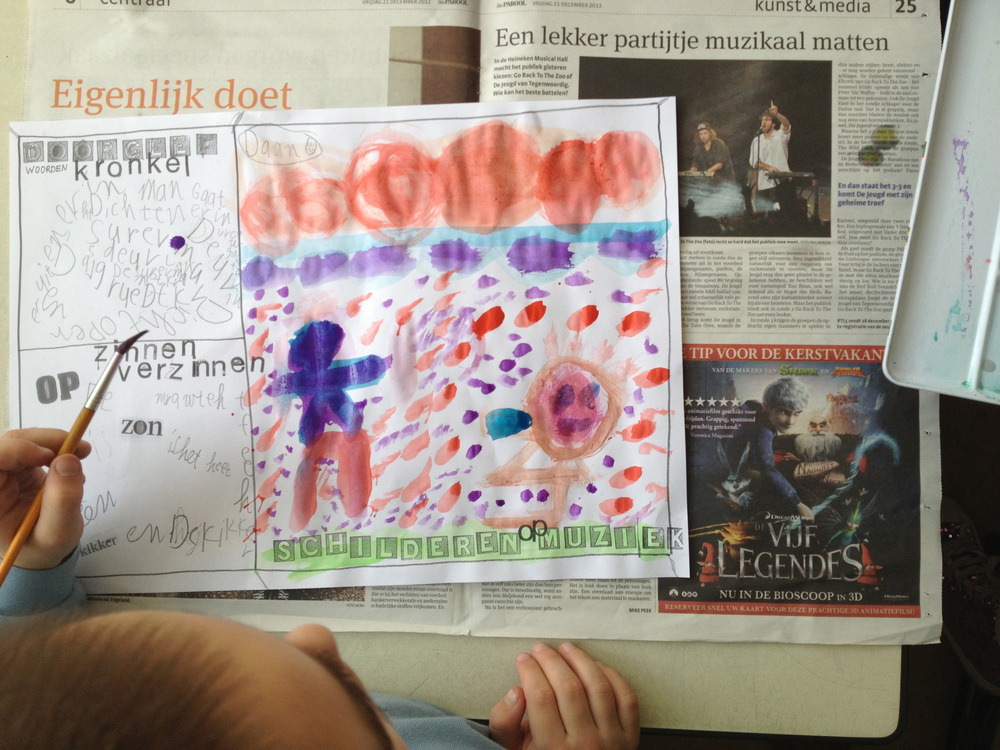 Juf Nathalie had wel heel veel bedacht vandaag voor groep 4A! Drie associatievormen om op verhaal te komen voor de grote schrijfopdracht van volgende week. Dat betekende hard werken! De kinderen maakten een woordkronkel, maakten zinnen af bij gegeven woordjes en schilderden daarna met waterverf op muziek, want……wisten jullie dat iedere muziek zo zijn eigen kleur oproept bij iedereen? Volgende week gaan we nog een mooie zin bij ons schilderwerkje bedenken.