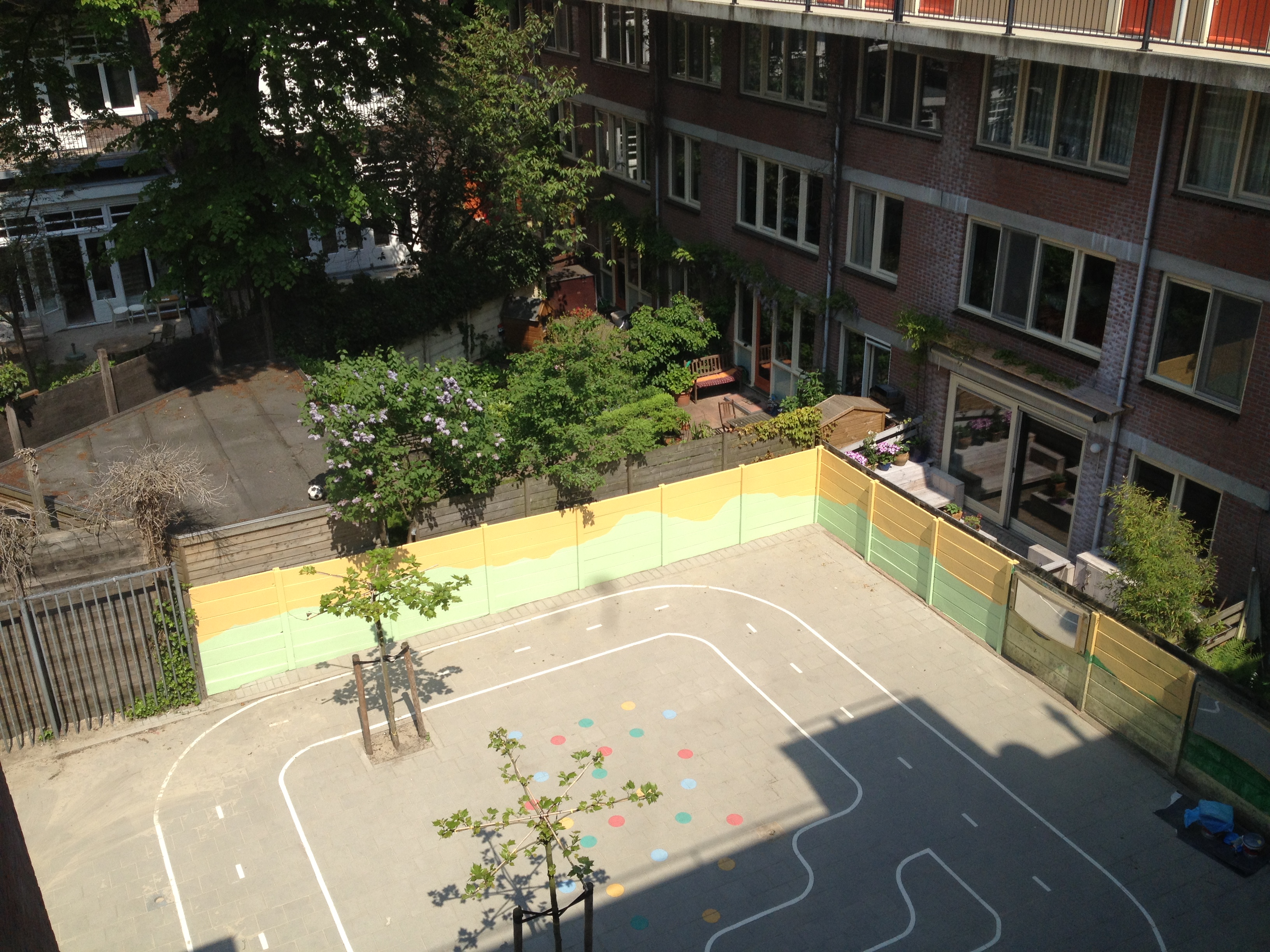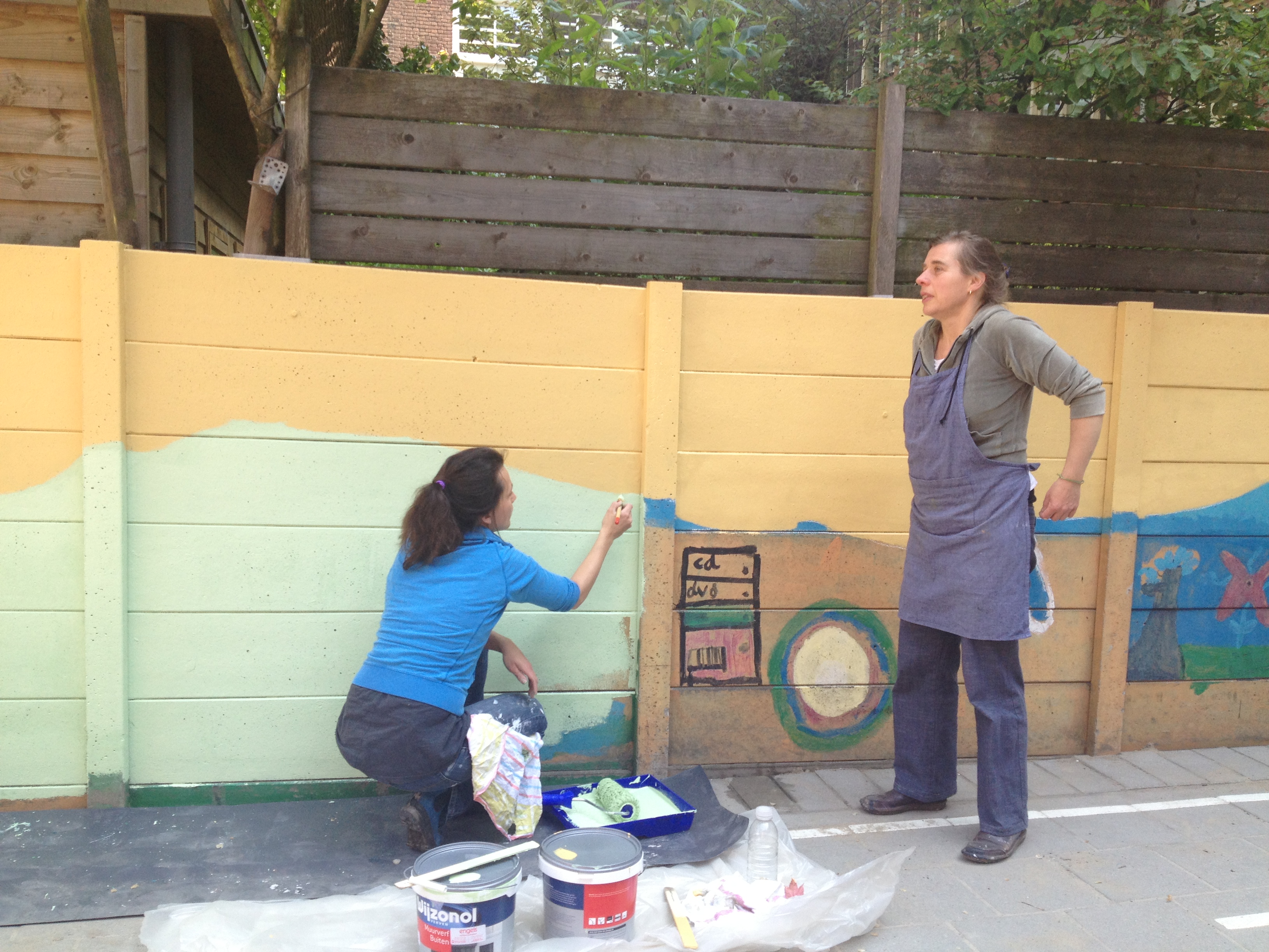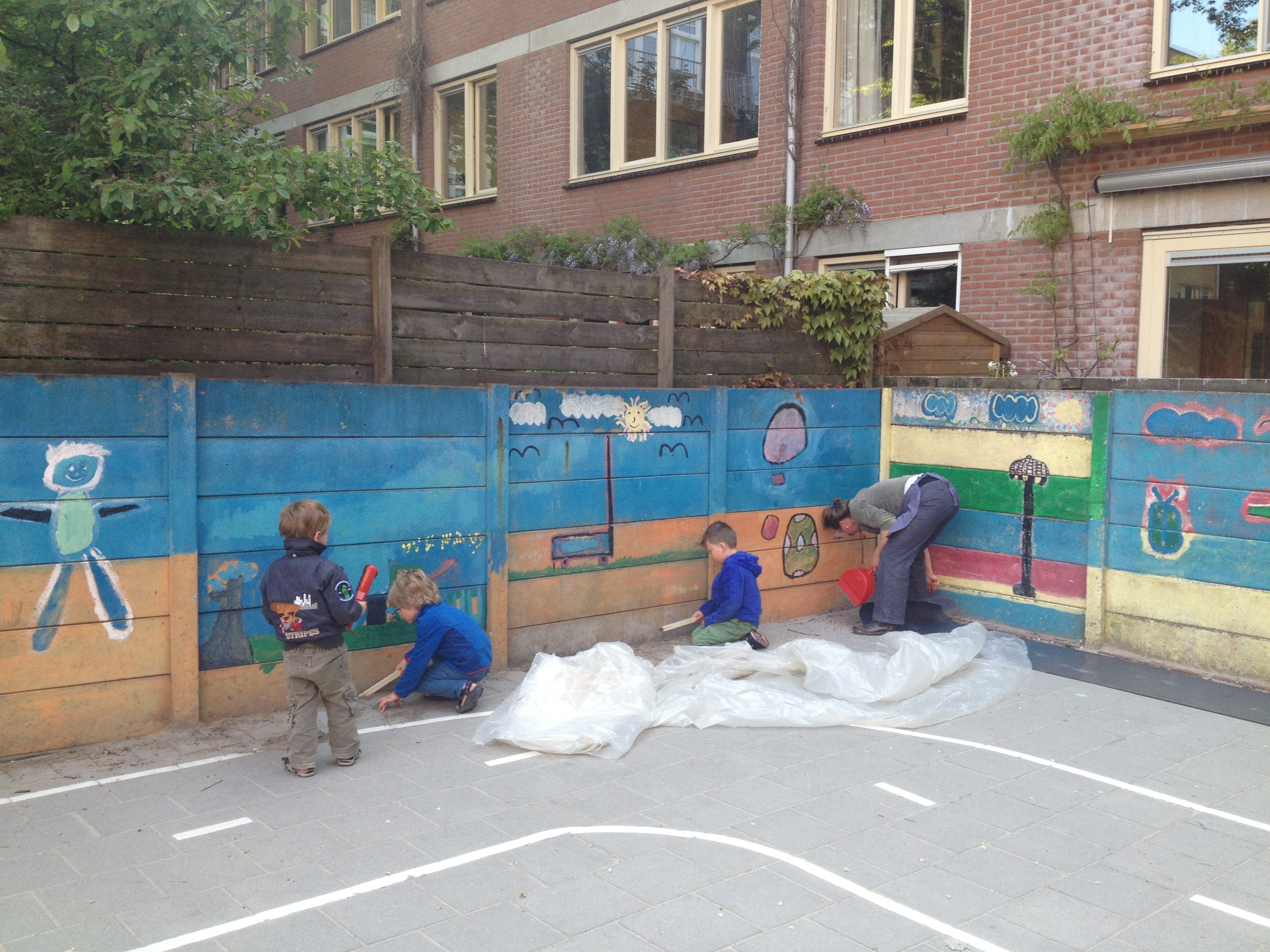 Juf Nathalie en Baukje werkten vandaag aan de eerste lagen grondverf voor de muurschildering op de speelplaats. Het was eindelijk lekker weer! Dat leverde aan het eind van de dag al een aardig strak beeld op. Nu kan het echte werk beginnen samen met de kinderen! Laten we hopen dat de weergoden ons gunstig gezind zijn de komende weken….
