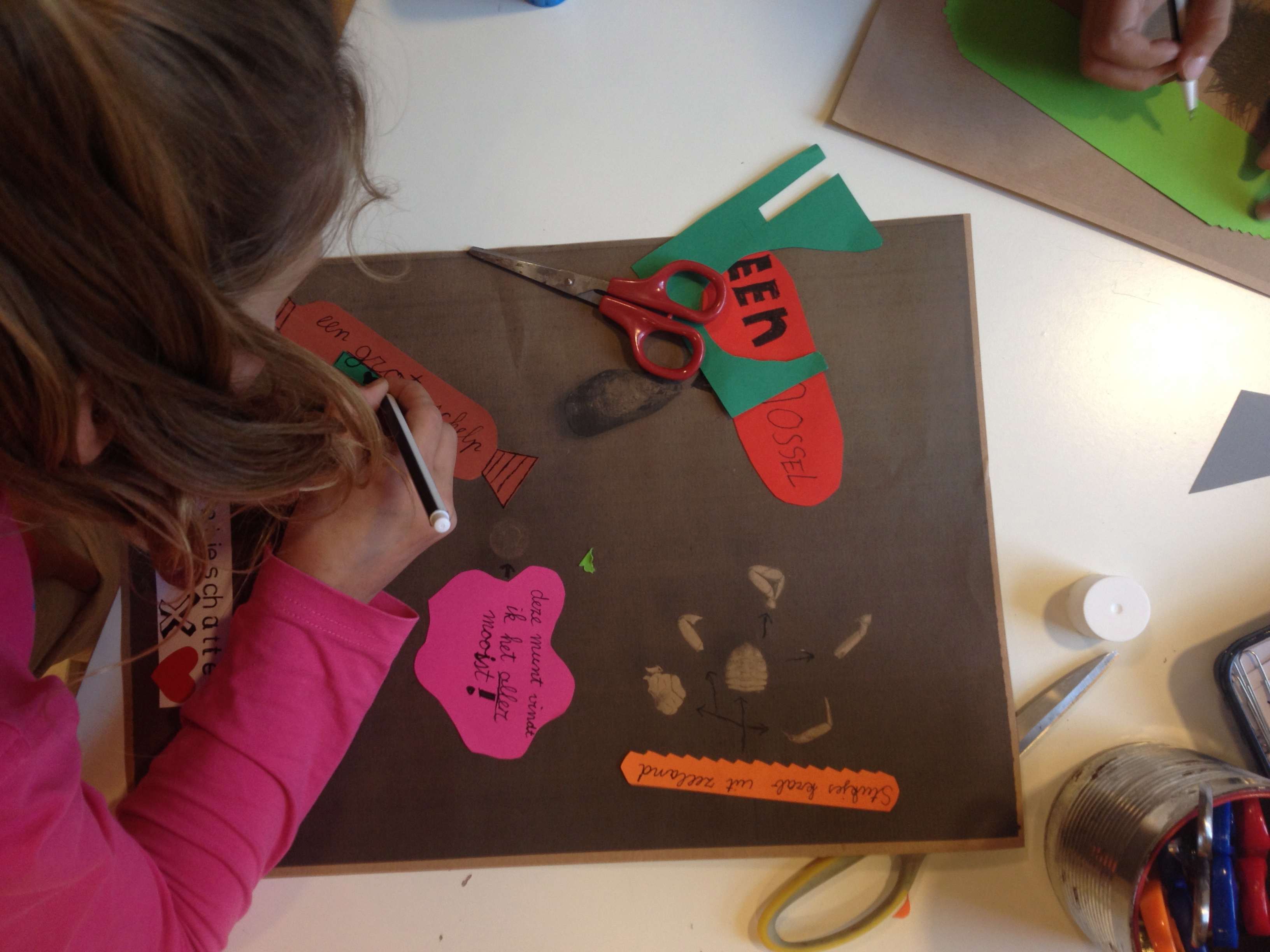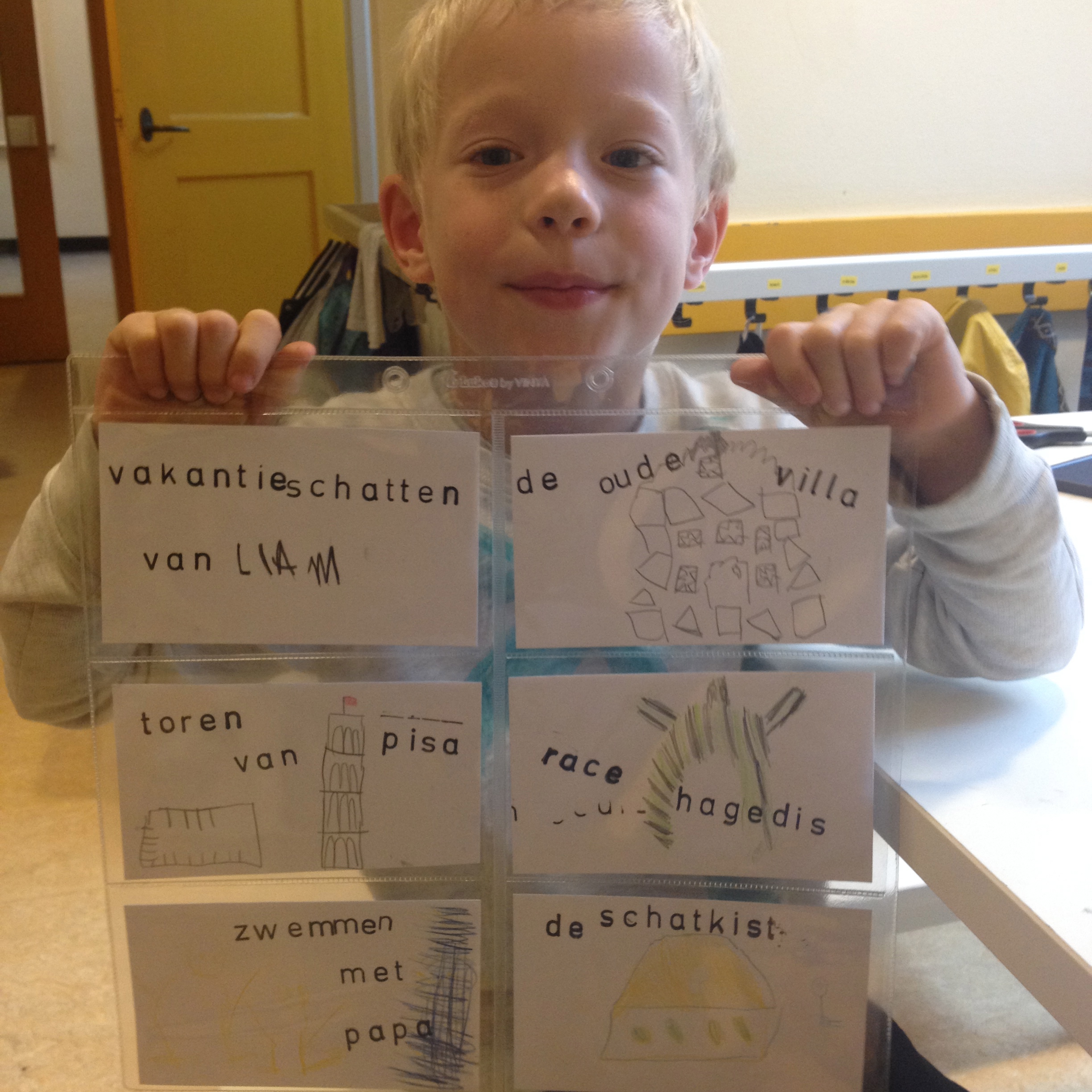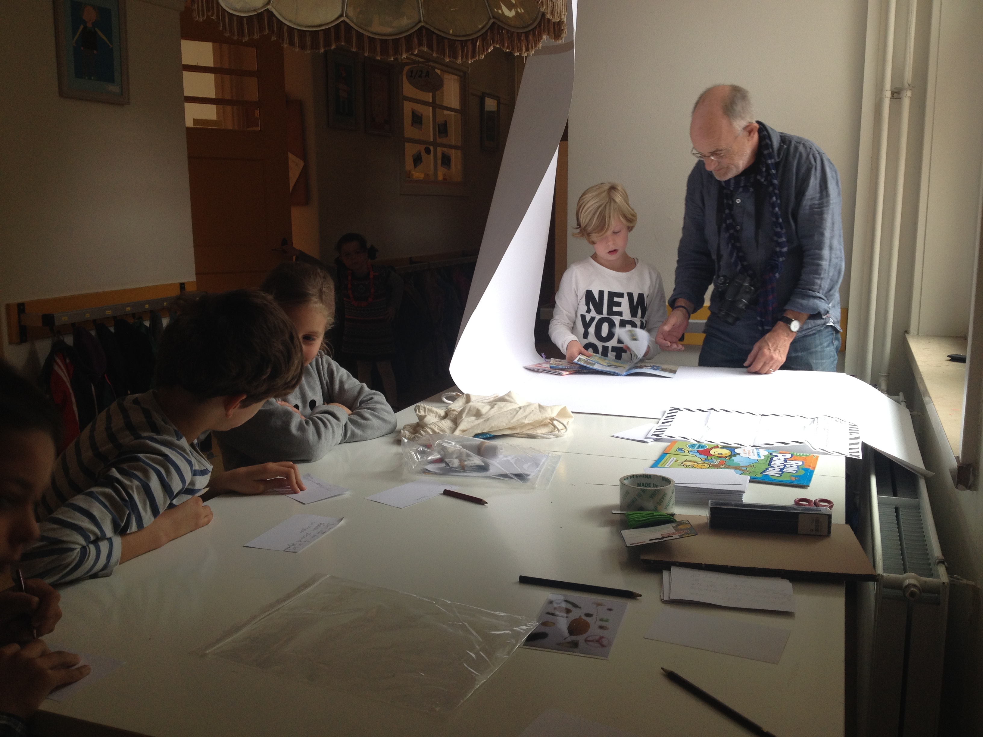 De groepen 5 maakten vandaag in ons geïmproviseerde fotostudiootje op de kleutergang, samen met meester Frans, een foto van hun schatten. De meest bijzondere in het midden, de rest eromheen. Benieuwd naar het resultaat? Nog twee weken wachten, dan kunnen jullie de foto’s en de bijbehorende verhaaltjes aanschouwen in ons museum!