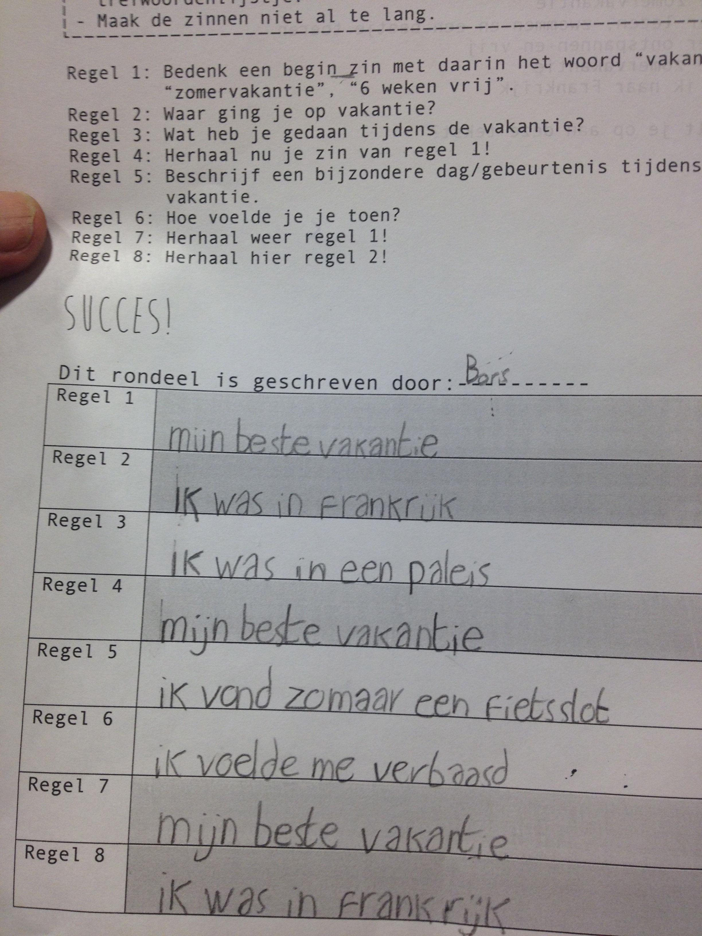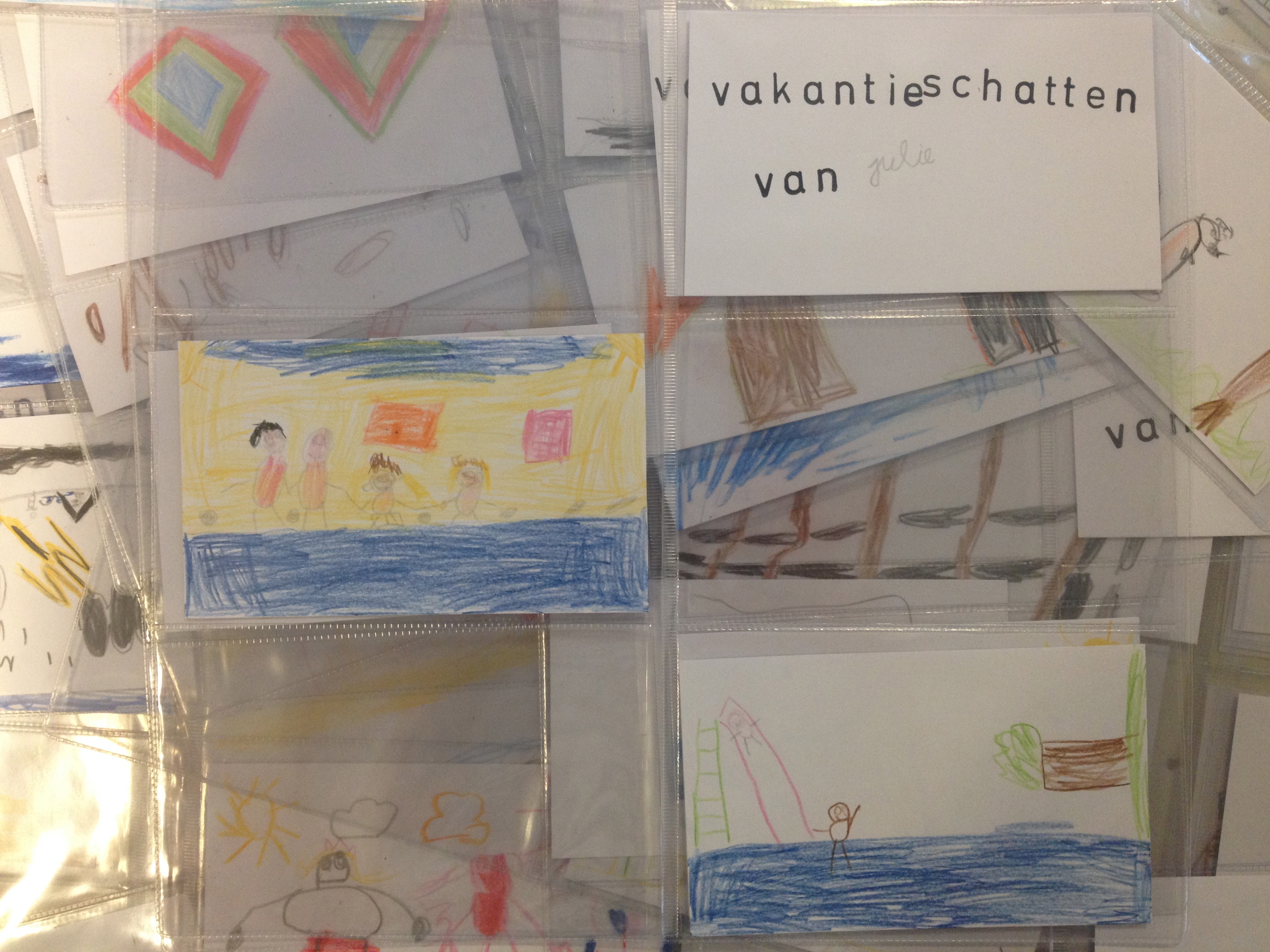 Een rondeel is een gedicht bestaande uit 8 regels, waarvan er een aantal herhaald worden. Een heel fijne vorm om eenvoudig een mini-vakantieverhaal in te beschrijven. Wat werd er geconcentreerd en gemotiveerd geschreven over de vakantie en de vakantieschatten. Volgende week gaan we de schatten in een mooi doosje leggen voor het museum en dan komt het rondeel er uiteraard naast te liggen.